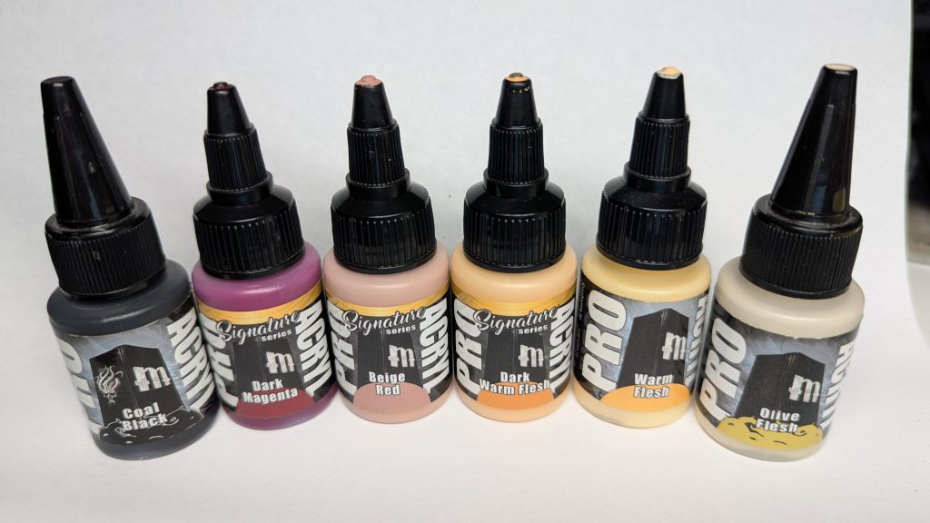 This is the palette of paint I’ll be using, but feel free to use any brand or equivalent colors you like. I like the Pro Acryl paints by Monument Hobbies, but any paint brand you have is fine; they are by no means e requirement.