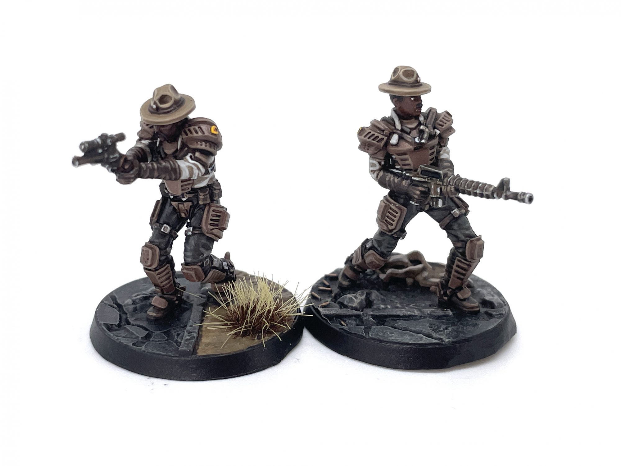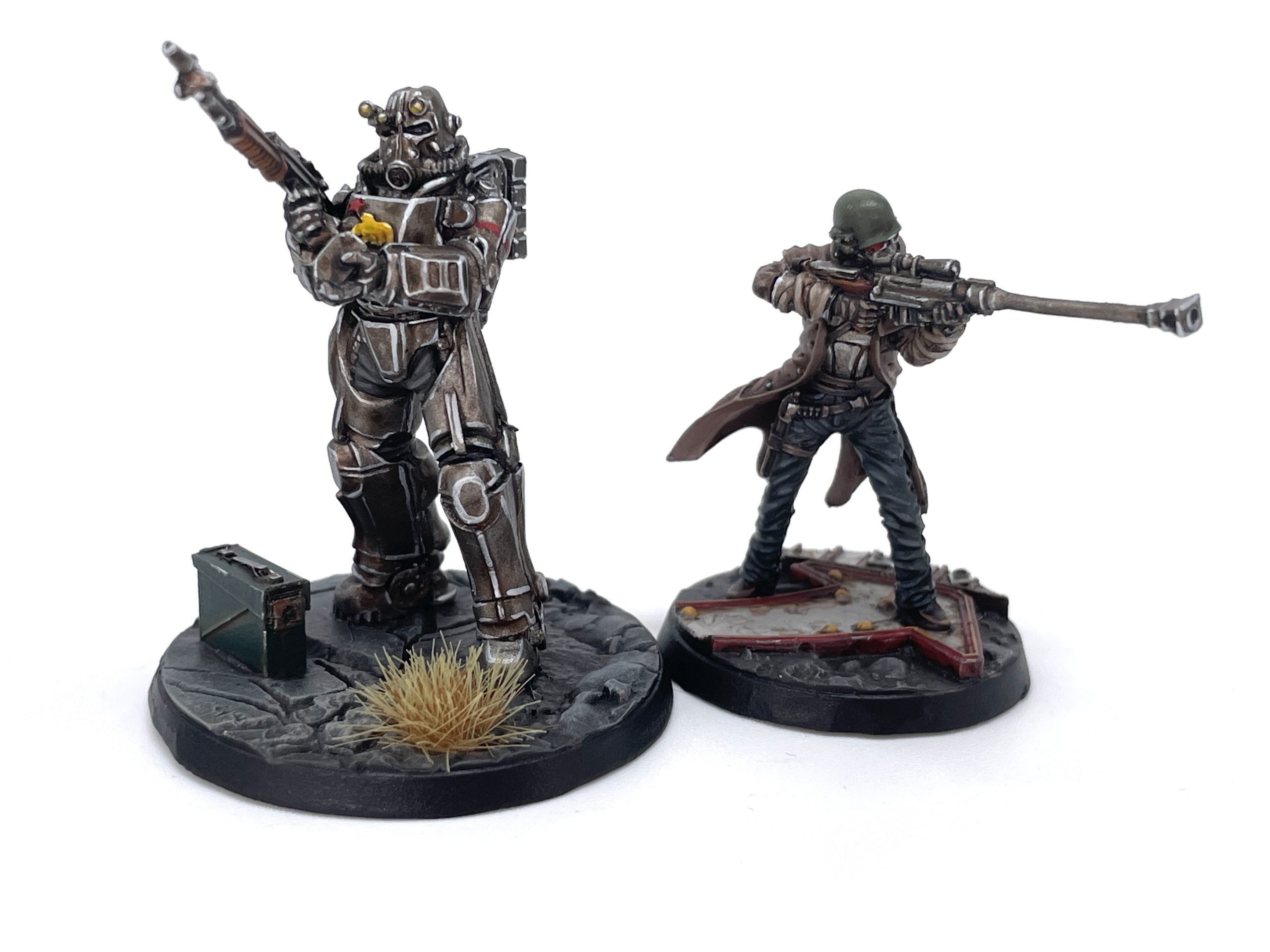 NCR Heavy Trooper and Veteran Ranger. Credit: SRMThis is more housekeeping than anything too specific. I painted the power armor the same as the Rusty Steel but with a little more rust, the red banding on the arms the same as the Badges step, and the undersuit is the same as the Ranger Dark Cloth. The eye lenses are just Pro Acryl Coal Black, and the lights on the helmet are Dorn Yellow. I also applied an extra wash of Nuln Oil to the batteries on his back for some slight variation.