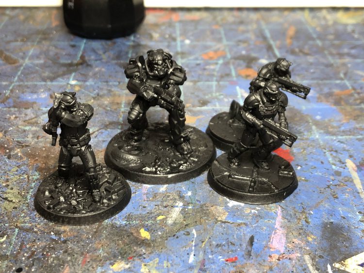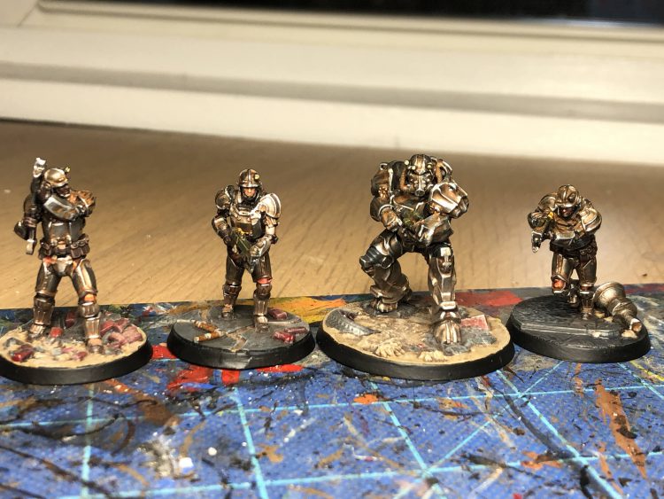 I then covered the models and bases wholesale in Agrax Earthshade to really bring in that "Fallout Brown" color. Everything's going to be weathered and dirty anyway so this is a good place to start. Give these a while to dry - longer than you're used to for washing a model. We'll be back with highlights, finishing touches, and then some.