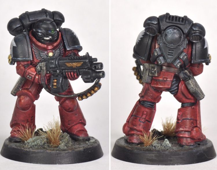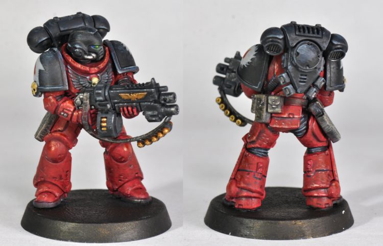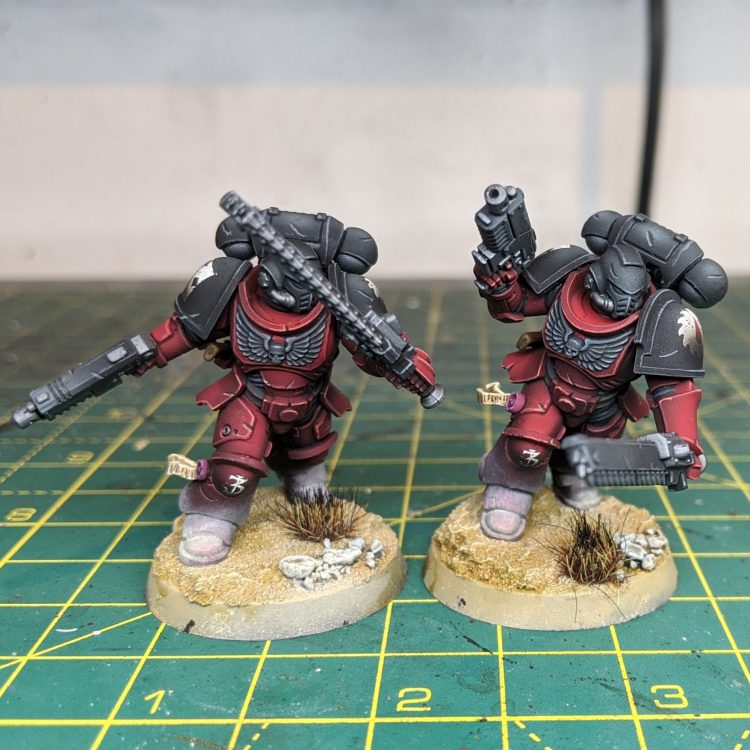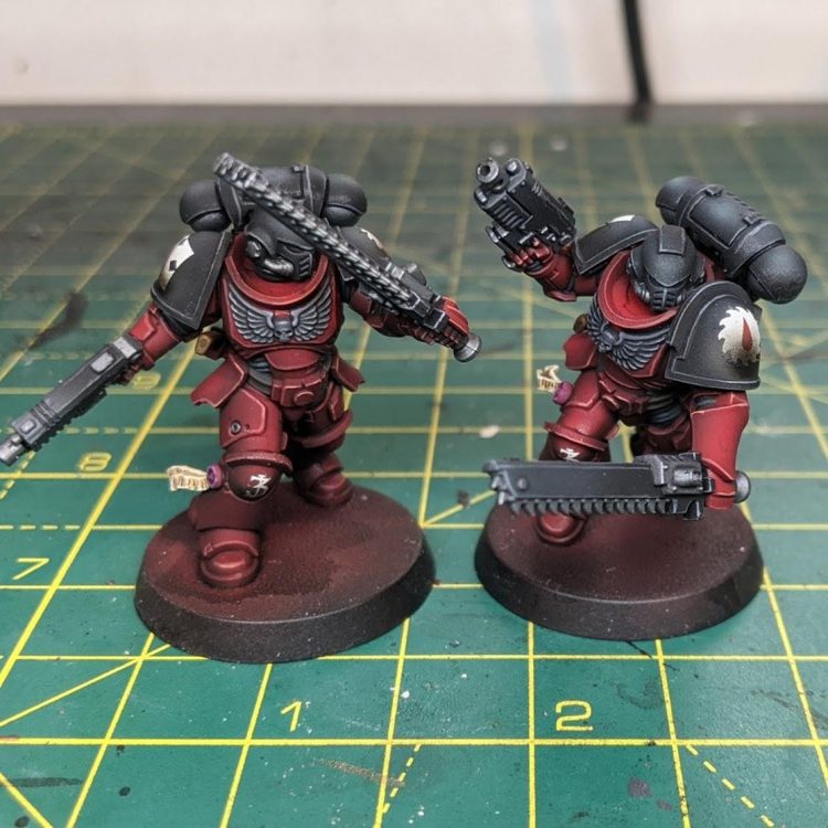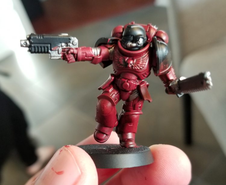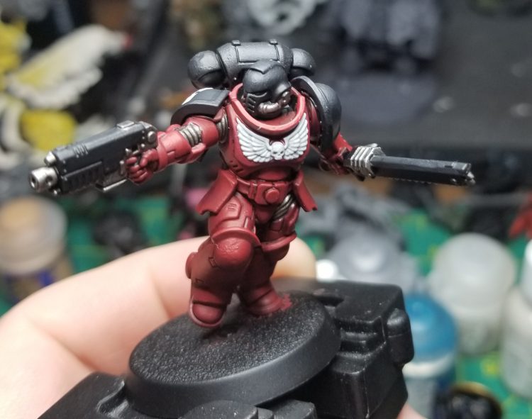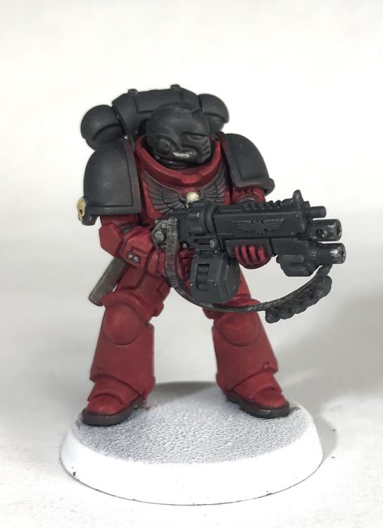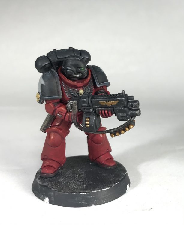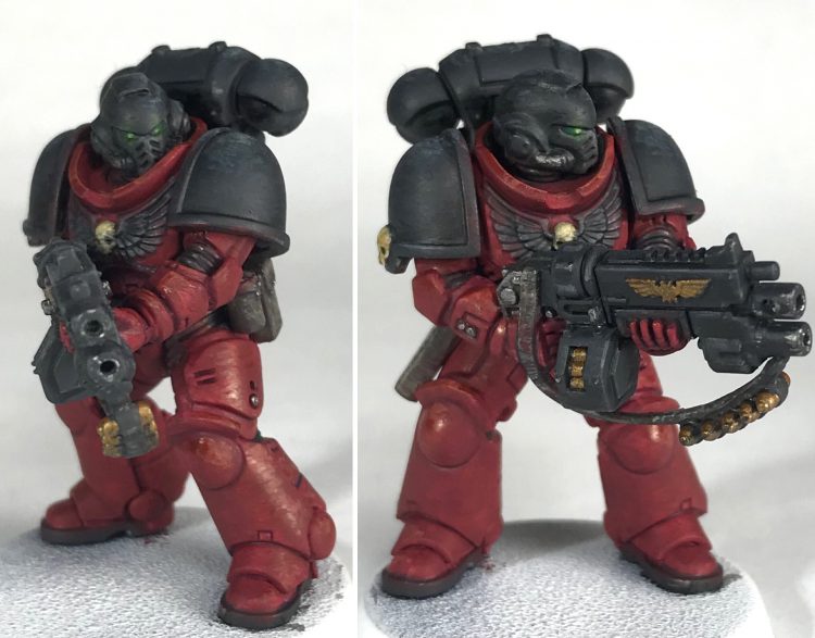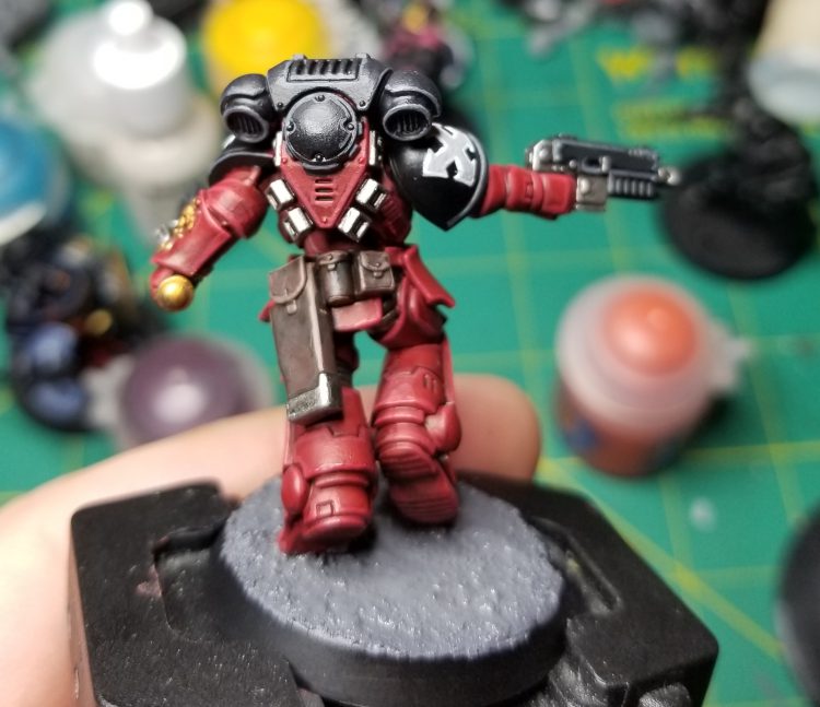 Flesh Tearers are a bit easier than your usual chapter with split armor in that their differently-colored elements are shoulder pads, backpacks, and helmets, all elements that are relatively easy to paint separately from the main model. This frees you up to be a lot less careful when applying base coats and highlighting to the red parts of your model.