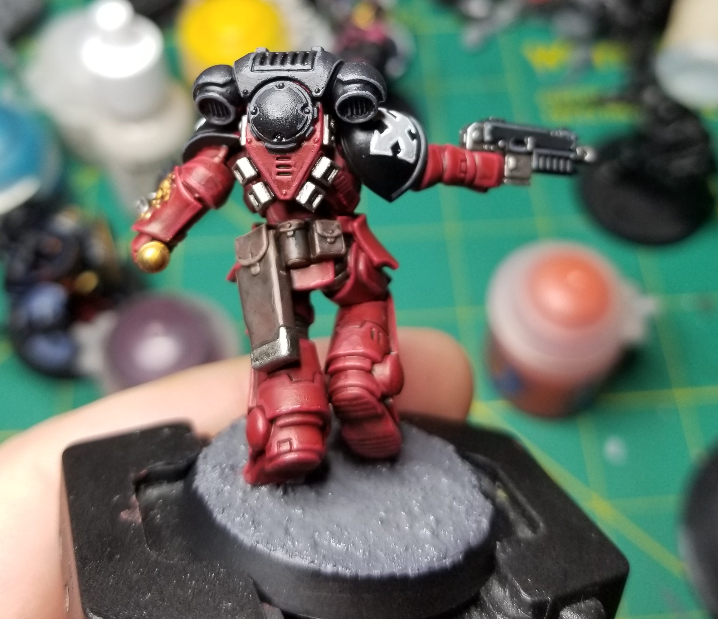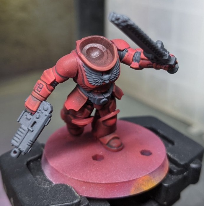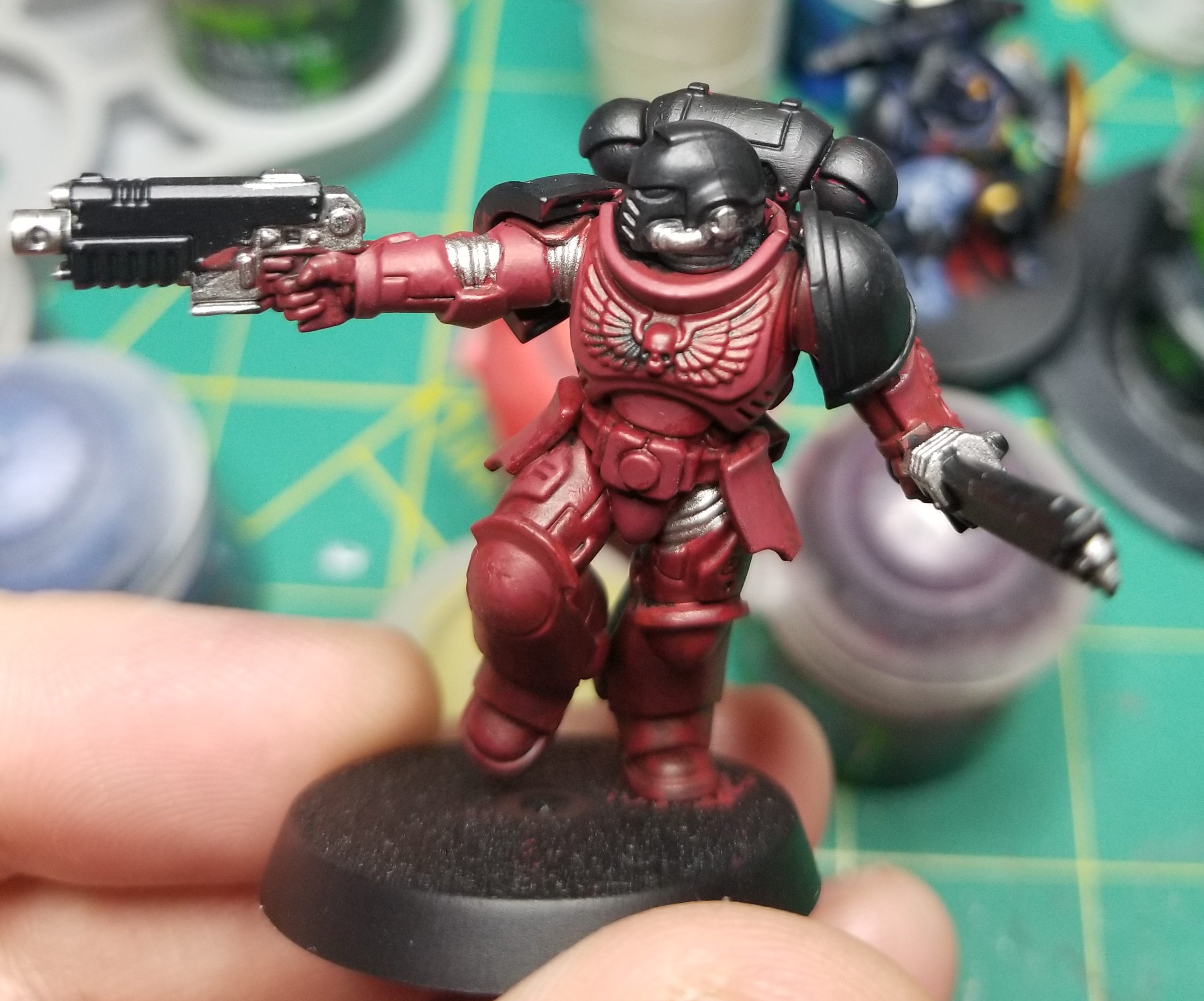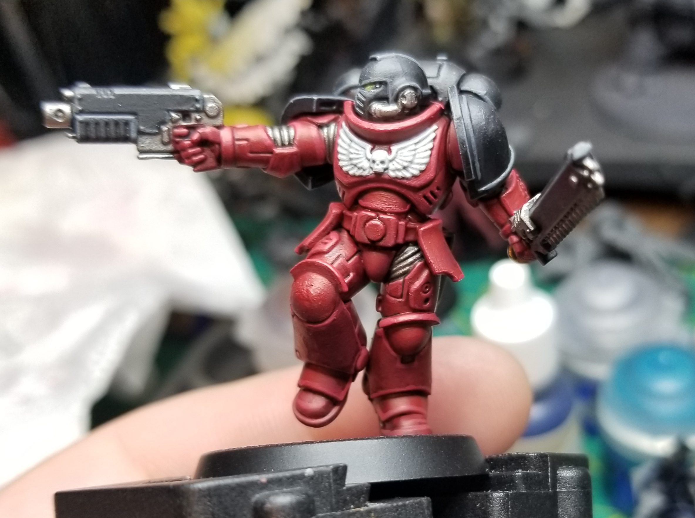 Armor: Bolter/Metal Bits: Shells/Aquila: Lenses: Basecoats: Vallejo German Grey for all the black parts of the armor. Citadel Khorne Red for all the red parts. Panel lines and recess shading Panel lines and deep recesses: Nuln Oil on Black parts. Druchii Violet on red armor. Nuln oil in deepest recesses of red armor. This picture has some loose highlights of a mid-tone grey on the black armor and Bloody Red on red armor, and a bit of Wylde Rider Red on highest points. Black Armor: Shaded with Coal Black. Some more highlight built up with a Coal Black and Stonewall Grey mix. Some edges on the rifle are stippled with Leadbelcher and some scratches added to simulate wear. Red Armor Shading: Nuln Oil stippled and splotched loosely over lower areas, along recesses, undersides of armor. A second coat of Nuln Oil for a few darker splotches in shade area. Red Armor Highlights: The armor is highlighted with a mix of Hyek Yellow and Burnt Orange, at least 2:1. Rather that doing continuous smooth edge highlights I did short lines and dots to give it a rougher appearance. The darker splotches were hit with the highlight color on the bottom edges to give them the appearance of a slightly cratered surface.Paints used: