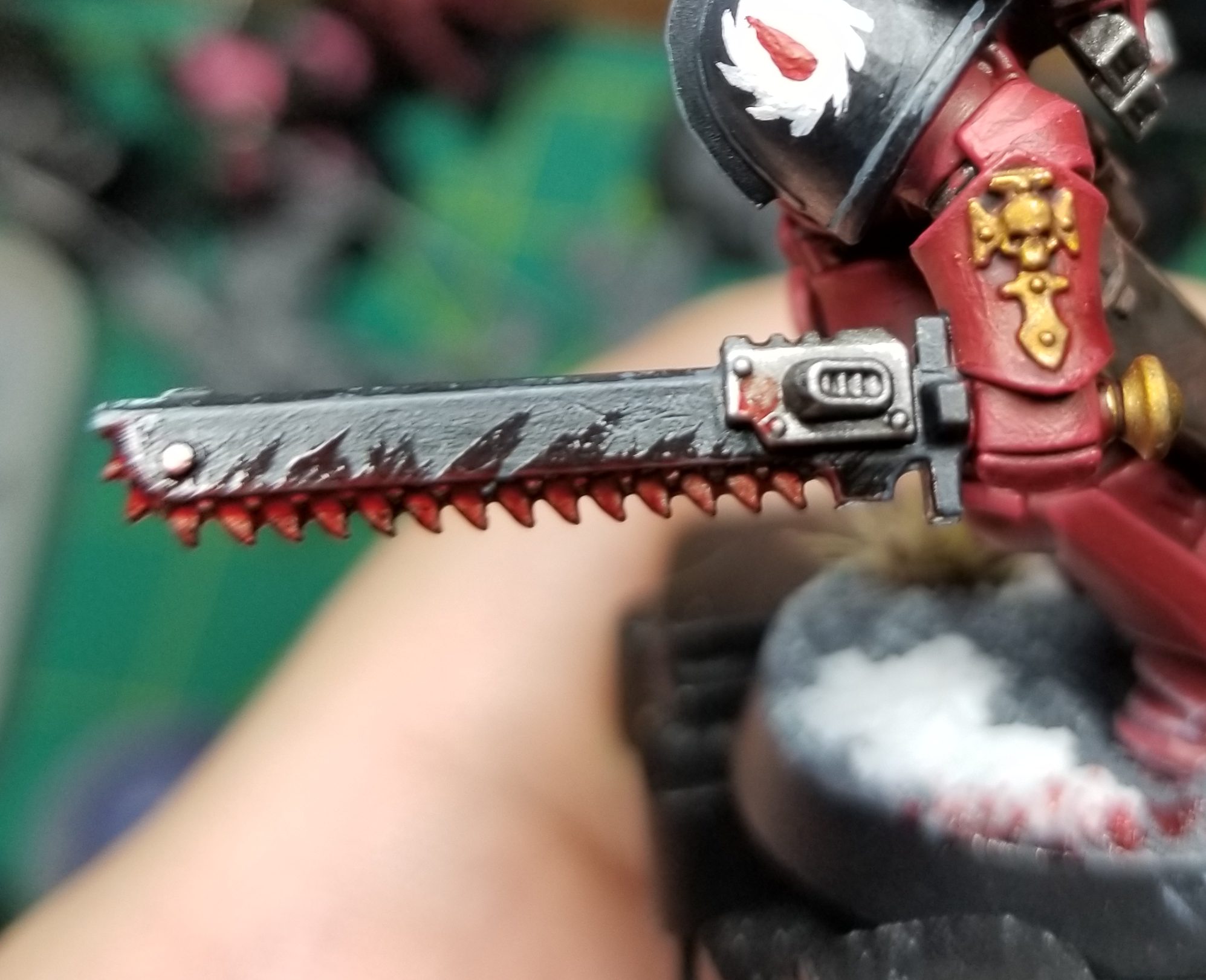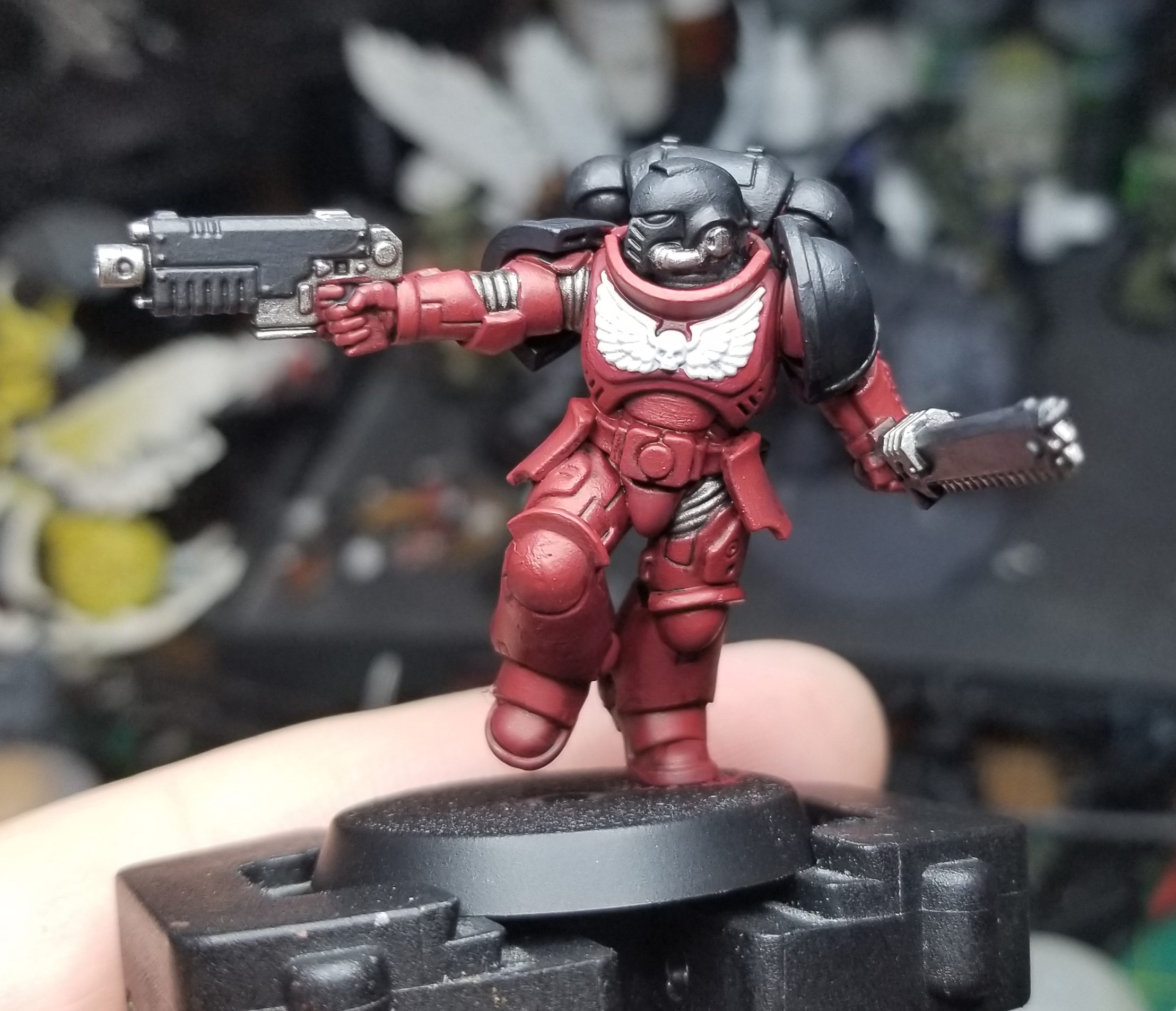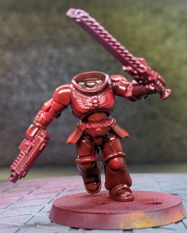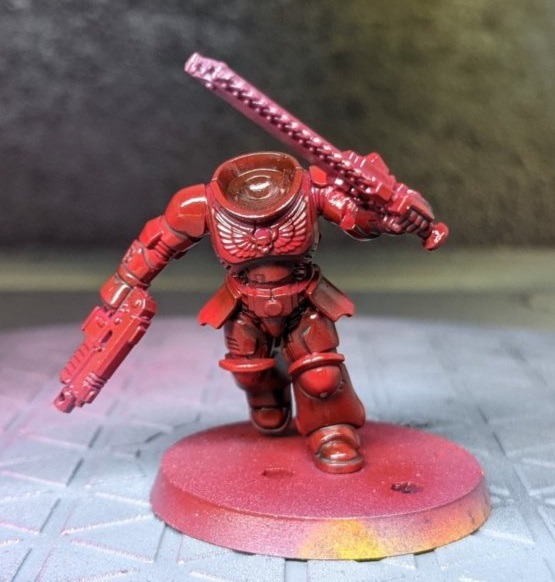 I've always been a fan of the Flesh Tearers since I first saw them in their Index Astartes article of an old White Dwarf. They have a striking color scheme and a very cool backstory. They're basically the cooler, Khorne-ier version of Blood Angels. The process started with an undercoat of black primer followed by a couple of thin coats of Khorne Red on the armor and some Leadbelcher on the metal parts. Then I laid down the black on the shoulder pads and helmet with Abaddon Black. Also this is the step where I realized I wanted to make the top of the backpack black. I've also started shading the red with some Carroburg Crimson. Here's where the more complex shading starts. I've traced the armor grooves with Carroburg Crimson and a bit of Nuln Oil in the darkest recesses, painted the Aquila and the Assault company marking with Grey Seer, washed the metal parts with Nuln Oil, and started shading the black parts. This is done by mixing Abaddon Black and Corvus Black and working up to Corvus Black on the raised parts of the black armor. You can also shade Corvus Black with Nuln Oil for extra depth. I'm also highlighting the reds at this stage, doing blends of Khorne Red with Mephiston Red. The White parts get washed with Apothecary White, which we'll then revisit, shading in the spots in-between feathers with Nuln Oil and doing some extra highlights with Reaper Pure White. At this stage I'm doing more red highlight as well, doing edge highlights on the red with Wazdakka Red. I also cover the eyes, doing them in a gemstone style using Warpstone Glow shaded with Coelia Greenshade and Nuln Oil and highlight with a spot of Moot Green. Next up is freehanding the saw blade icon on the left shoulder pad. I start with a circle and then paint the teeth off of that, then come back and add the blood tear with Mephiston Red. The black parts get an edge highlight of Mechanicus Standard Grey at this point and the gold parts are just Retributor Armour washed with Agrax Earthshade. The leather is Rhinox Hide washed with Agrax Earthshade then edge highlighted with Gorthor Brown. Now for the finishing touches. A Flesh Tearer should be blood-stained so I drop some Blood for the Blood God on his chainsword and some drops on the base to make him suitably stained. The base is Astrogranite drybrushed with Celestra Grey and then some Valhallan Blizzard and tufts of Army Painter static grass on top of that. I'm very happy with how this guy turned out and may paint more of these in the future if I can settle on a faster way to do the shoulder pad icons.Step 1. Basecoats