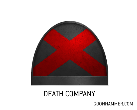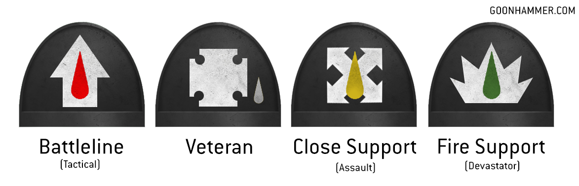 While the Flesh Tearers aren't a Codex-Compliant chapter - they follow the organizational structure of the Blood Angels - they broadly follow the Codex Astartes in a number of ways, including the organization of the Chapter and color markings for companies. However, rather than varying the color of shoulder pad trim, Flesh Tearers feature a single droplet on their right shoulder overlapping their squad designation, the color of which denotes their company. Unlike the blood angels, they mostly use the standard Codex Astartes colors for their companies. Flesh Tearers use white gothic script on their right kneepad to denote their squad number within a company. Death Company are marked in a similar fashion to Blood Angels, with black armor bearing a red X across the right shoulder.