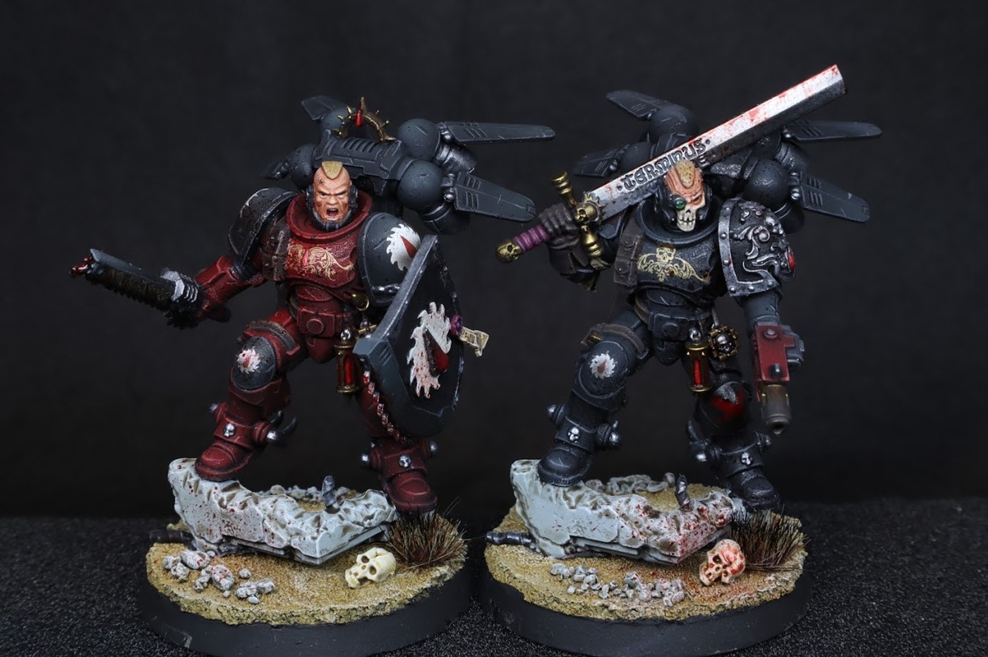 Hi there readers. The staff at Goonhammer were kind enough to reach out and ask me to put together a guide on how I do my Flesh Tearers. I owe a great debt to their painting guides as I was inspired by their How To Paint Iron Hands article a while ago to make significant changes to my own process, and I was beyond chuffed that they’d given me the opportunity to contribute some of my tips in turn. First, a note on assembly. I like to keep my helmets and backpacks attached with blutac at first so I can get the initial shades done with the whole model then work in subassembly, but you can get away with just keeping the head separate if it proves too fiddly. Prime with Stynlrez Black. You can add an optional layer of VMA Black so the surface isn’t as matte if you prefer. Next preshade black armour with Tamiya XF-2 Flat White, thinned 4:1 with their X-20A Thinner. You could use any white here, but I strongly recommend giving Tamiya a try. It has a much lower tendency to speckle or spider compared to other solutions like inks or white primer, you can build from a grey up to pure white, and it clogs less in the airbrush. When shading, pick a light source you want to use and stick with it across the model. You want to leave pure black on the surface and just add a highlight where the light will hit it the most. Shade with Black Templar Contrast. We’re using the BT contrast as a tint here to bring the pure white back down, and use the greenish hue of the paint to add some visual interest to the model. Spray from the centre of your highlight out so you keep a smooth transition to black. Remove your heads and backpacks, stick them to something so you can paint them in subassembly, and mask off the black armour with Masking Putty. Preshade the red armour with flat white. The approach here is slightly different as we want to make sure only the deepest recesses are left pure black. As contrast paint is transparent if there isn’t anything underneath for it to tint it won’t show much colour. If you like deeper black to red transitions you can be more sparing here, I prefer my red armour to be on the more vibrant side. Shade red armour Flesh Tearer Contrast thinned 3:1. Here we want to shade from the recesses towards the brightest spots so we keep the saturation at its highest where light hits the model. You’ll need to give it 3 or so passes, just keep going if it looks pink and remember to pause to let the model dry if you’re unsure if it needs another layer. If you want to see this process in more detail I’d recommend watching Cult of Paint’s excellent tutorial on preshading via their YouTube channel. Apply an all over coat of Vallejo Mecha Gloss Varnish and let it dry for 24 hours. Transfers - I’ll keep this brief as plenty has been written here already; I get all my sets from Mighty Brush and do the following: Wash with Army Painter Quickshade Dark Tone. Mix your Dark Tone with their Quickshade Wash Mixing Medium and some Warcolours Surfactant with equal parts surfactant to your dark tone + medium mix. I use 3 parts Dark Tone to 2 parts medium, you can go darker or brighter by adjusting this ratio The surfactant is what makes this really magic; with this in the mix your wash will slide right off the model and only stay in the recesses. Slather your mix over the whole mini. Keep an eye on it for about 5 minutes and if you do see pools like this one on the leg plate building up wick them away with a clean brush. Next, wash the joints and crest with pure dark tone to push them further. Once your wash is dry (I give it 24 hours) apply an Ultra Matte Varnish. While you’re there shade the lower half of your transfers with thinned (3:1) Liquitex Black Ink to blend them into the model. Edge highlights We’re not aiming to hit every edge here as we’ve already got highlighting from our airbrush gradients, instead try to aim for only edges that would catch the light with your first stage highlight and only the most dramatic edges with your second stage. Reattach the heads and backpacks with some super glue Dab a bit of sponge in black paint, drush it off on some paper towel until it’s just leaving speckles, and apply some speckling to the transfers. Draw some black lines and chips the armour with black, then edge highlight them with your second stage highlight. I apply text to the parchment at this stage with a Sepia Micron Pen. Use cork sheets to build up depth, cover it with Vallejo Earth Texture, add rocks for variety and let it dry for 24 hours. Prime the whole surface, base it with Zandri Dust, wash with Seraphim Sepia, then drybrush with VMC Buff and Pale Sand. Rod your mini to the base. Don’t try and get away with just super gluing them, you will rip the base apart the first time your mini snags on something. Yes I know this from experience :( Apply some sand pigment to the lower legs and the base, I use North Africa Dust. Apply another layer of Ultra Matte Varnish to bind the pigment and give the whole model a consistent finish. Now it’s time to fix our metallics to get their sheen back up and paint the details on any reflective surfaces like lenses and gems. Reapply Black Metal leaving your shade in just the recesses, and edge highlight with S75 Heavy Metal. I’m not going to write how I do my lenses as I’m using a method from Mighty Brush’s how to paint Blood Angels guide. These are wonderfully laid out tomes that go into detail on many of the techniques I’ve used here and I can’t recommend them strongly enough. You can also use Goonhammer's tutorials from How to Paint Space Marines, or How to Paint Lenses, gemstones, and vials. The fun part! Get a brush, load it with some Blood for the Blood God and get your airbrush out. With some kitchen towel laid out, give your brush some test blasts with your airbrush. Vary the distance between the brush and the towel and your airbrush and the brush until you find a level of spatter that works for you. You don’t want to 