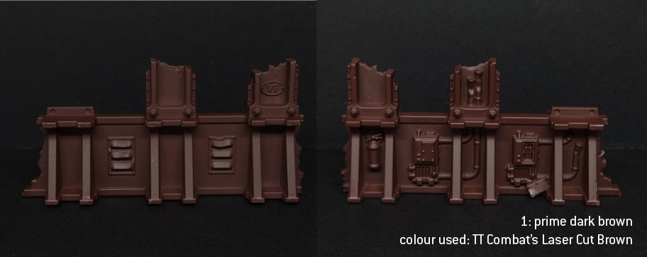 This method is easily adapted to different colour schemes, since the basic principle is quite transferrable: prime with a dark brown, zenithal spray with your main colour, and do some very quick detailing. It's blisteringly fast... or at least it was, until I decided to add a grime stage that takes me ages, but which I think really lifts it. I haven't yet had time to try this same method with alternate colours, but I've still got two more Fronteris buildings on sprue so I guess I'll report back later.Here's how the method looks when finished: