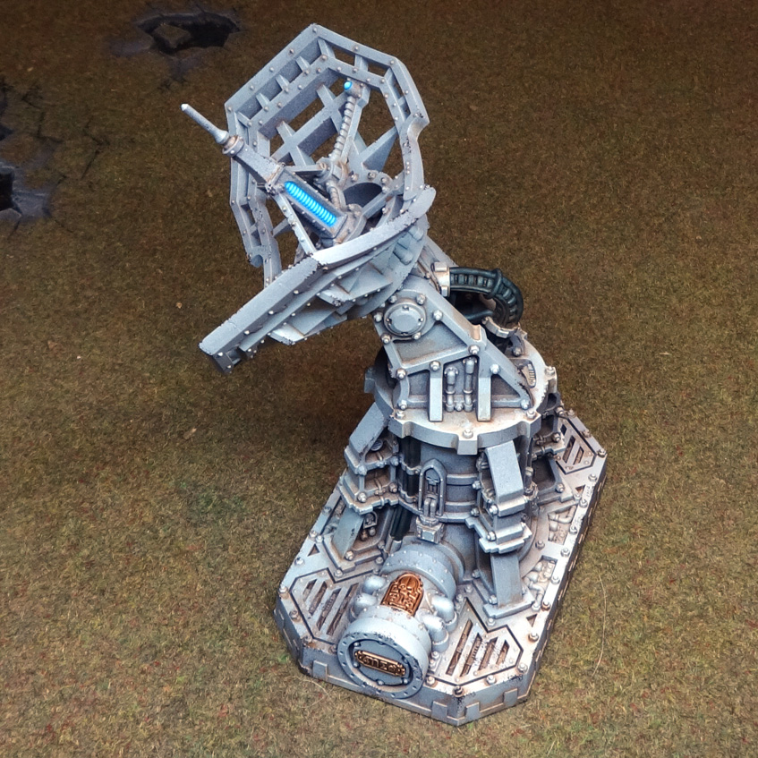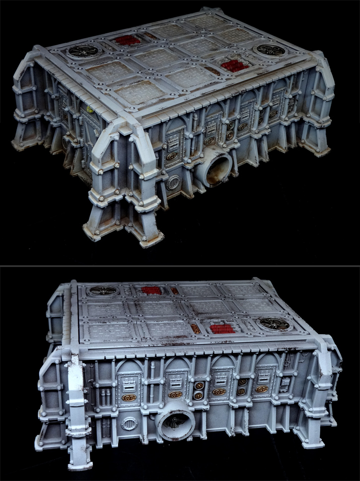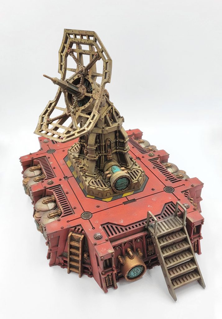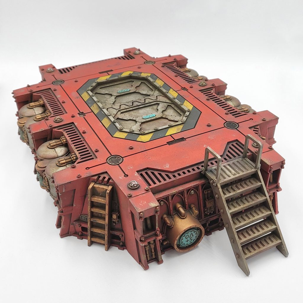 Battlezone Fronteris Landing Pad. Credit: FowlerLastly, I used weathering powders to add some extra interest. In this case I used black, light rust, dark rust, and a little bit of verdigris (around the gold details). I am a firm believer in sealing weathering powder in with varnish to make them a bit more... nuanced? Is that the right word? Occasionally spritzing some varnish also locks the powder in AND strengthens your end result - but you don't have to seal them up if you prefer not to. Last up, I hit some of the light details with a dab of silver paint and GW Spiritstone Red gem paint to stand out a bit more.