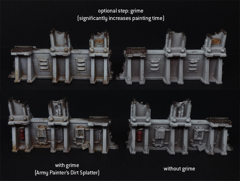 Here's the big time sink. If you're wanting to get terrain on the table fast, I'd skip it. It should also be noted there's a number of ways of adding grime; one could in theory just slosh a shade over the whole mini, but the staining this creates would have a very marked effect on a light colour like Grey Seer. You could also use an enamel wash, but that's a very grimy and imprecise method, so for me, a thinned and carefully applied recess shade of Army Painter's Dirt Splatter was the move. Here's a comparison:
