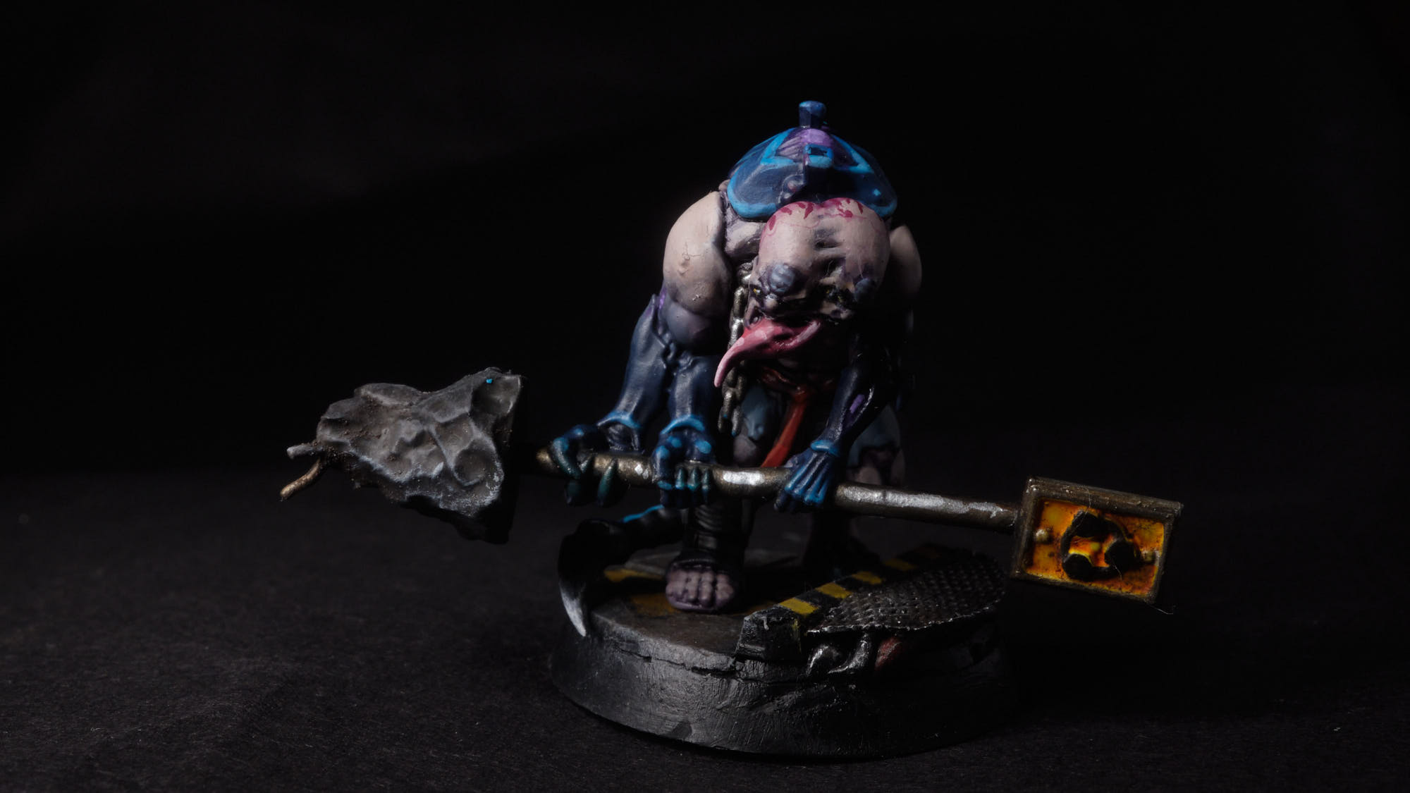 I started by highlighting the skin by just mixing Kislev into the original base coat a bit at a time until I was happy. Next up was the red bits most of which are pretty simple, the claws and tools are squig with the claws getting Kislev as a extreme highlight. The cloak got a more complex highlight, I started by placing a few extreme streaks of Squig which I glazed a bit of a transition to, then I glazed a few streaky highlights of Kislev over that before finally thinning down Flesh Tearers that I applied as a filter to the whole cloak, which knocked down the extreme highlights into something I am quite happy with.