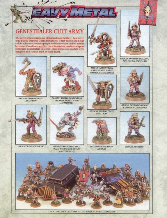 Despite being a recent army addition for most, the Genestealer Cults are one of the oldest factions in Warhammer 40,000, appearing in Rogue Trader as an insidious force resulting from infection by Genestealers. In their earliest incarnations, Genestealers were just another alien race, spreading form the moon of Ymgarl, completely separate and unconnected to the Tyranid threat (though they'd later be identified as the vanguard Hive Fleet Behemoth as the fluff was revised). Genestealers got a scarier (and decidedly alien-inspired) overhaul with the release of the Space Hulk board game, which also reintroduced them as a more sinister, widespread threat capable of infecting humans and other races. Old school Genestealer Cults had some incredibly funky models and relied a lot on conversions.