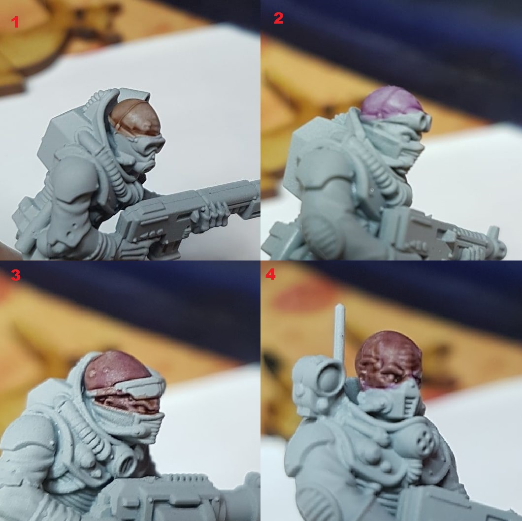 A quick note: I keep the heads separate from the body until they are both fully painted. This makes it trivially easy to paint hard-to-reach areas like the collar, base of the skull and under the chin. Once both head and body are fully painted, I superglue the heads on (or magnetize them if there are alternate heads I want to swap between). First let’s go through clothing, leather, armor, and metal. Next we’ll cover the carapace, followed by skin. Then finally we can go over the remaining details. The order below is the exact order in which I put paint on Acolytes.