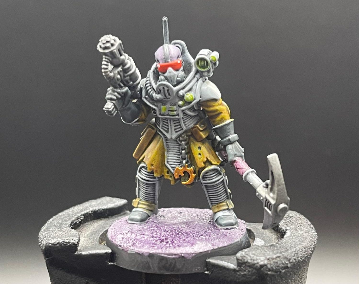 At this point I decided to breakup the face mask by applying Black Templar on the sides of the rebreather. Now for basing, I start by applying Astrogranite with a texture tool and once it’s dry I apply Druchii Violet.