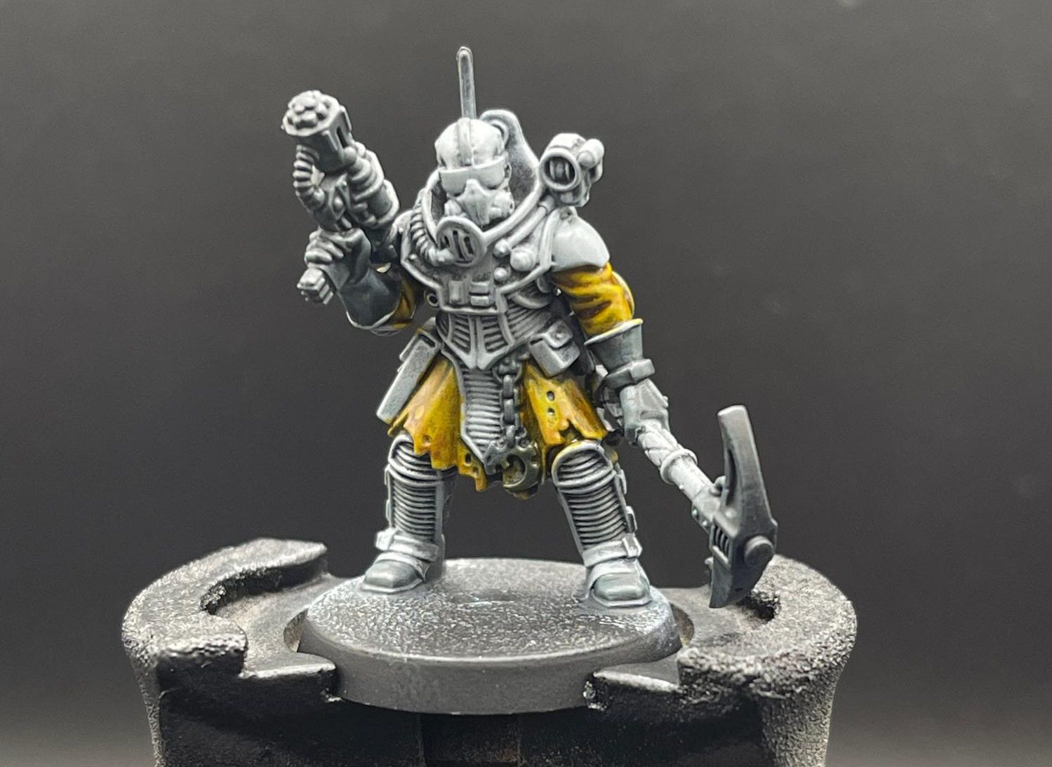 Then I drybrushed the model again using Celestra Grey, again putting extra pressure on the cloth and skin to get it nice and bright. Now we start using contrast, starting with Black Templar I block in all the pipes, metallics, boots, and rubber glove parts of the model. On the gloves I like to leave the little rim in grey, this gives a bit of separation once it’s all done. Next I block in the yellow cloth using Nazdreg Yellow. Don’t worry if you catch any of the grey areas with the yellow, you can apply Dawnstone or Celestra back over it.
