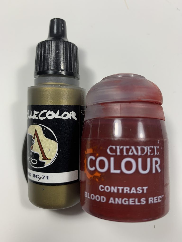 Once this was dry I filled covered the areas that were previously red with Citadel Colour Contrast Blood Angels Red. I didn't buy anything specific for this and if I was going for a genuine colour match I definitely would've used a slightly more yellow gold.