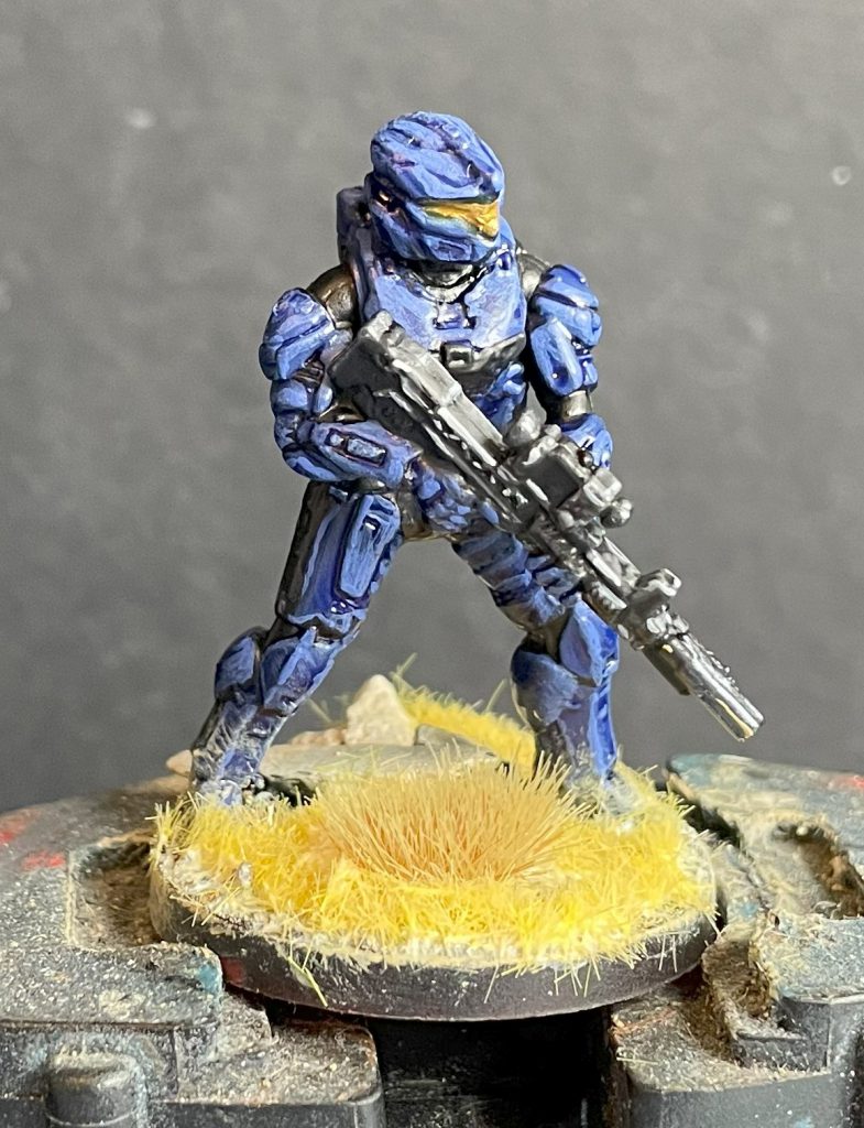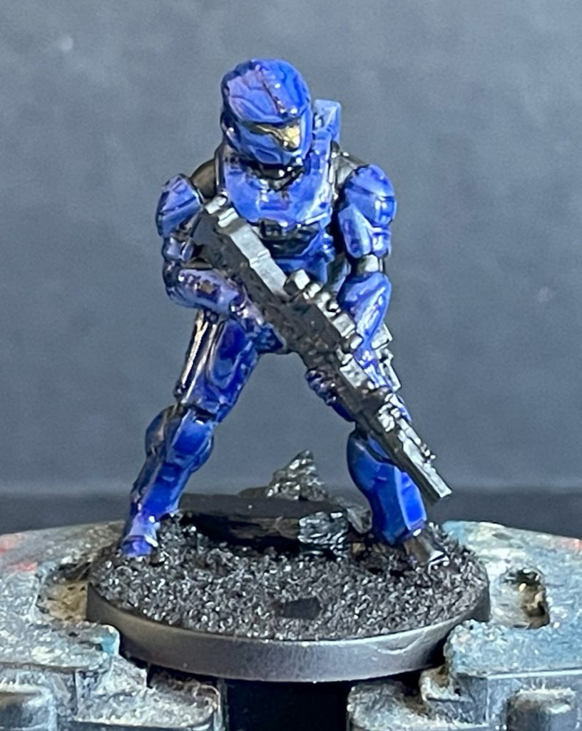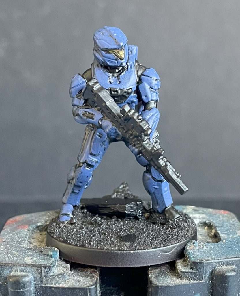 Lenoon's SpartansAfter the armour was done, I touched up any areas of the undersuit that had caught a little red or blue with black, and moved on to the weaponry. UNSC weapons in Halo don't tend to be metallic in many places, so both guns were layered with Vallejo Model Colour Neutral Grey and an extreme highlight sparingly with Sky Grey.