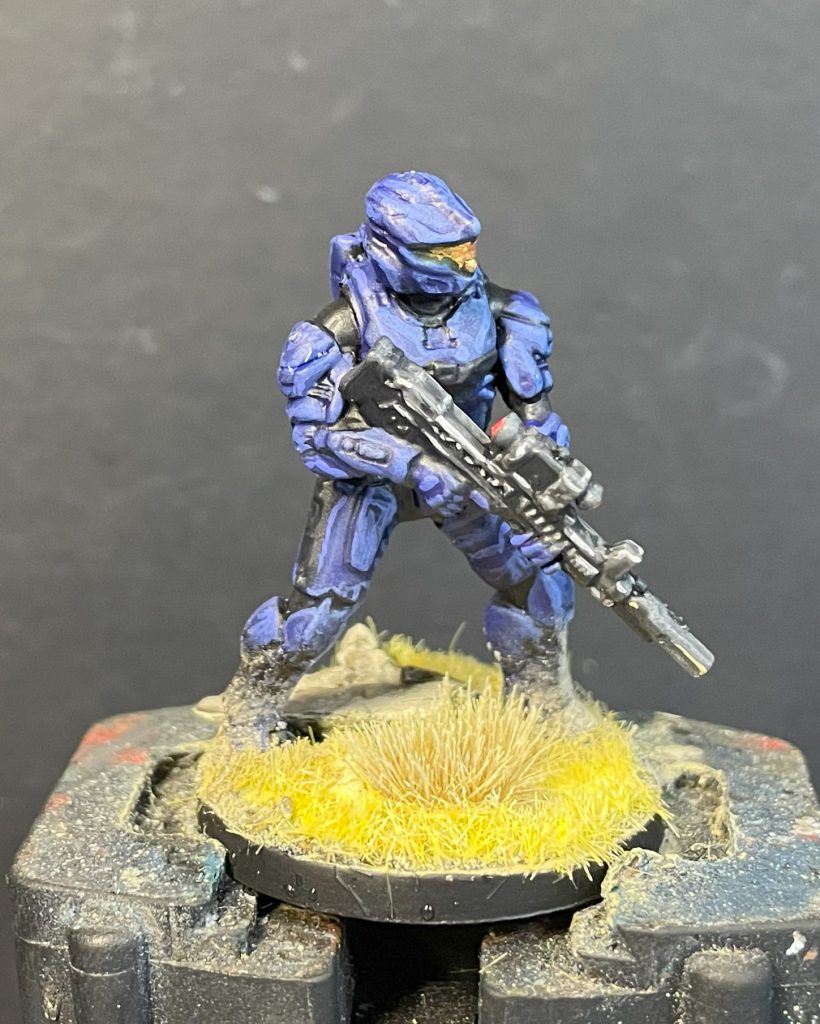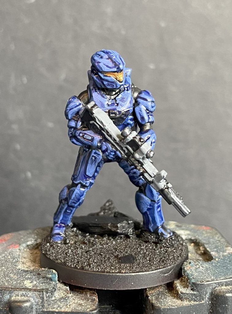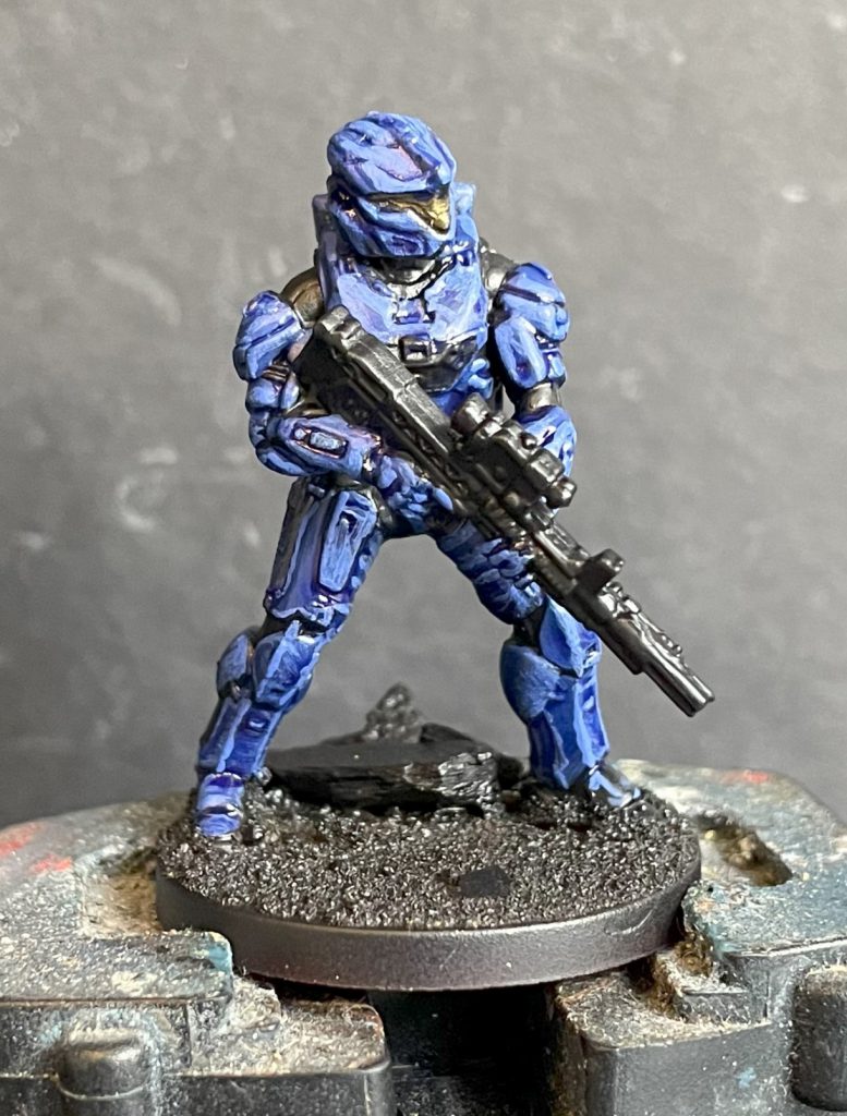 Lenoon's SpartansThis looks pretty messy, shiny and dark, so move on to a really rough highlighting layer. Spartan armour is made up of a mix of sharp edges, highly delineated panels and curved surfaces, so neither wholly edge highlighting or wholly volumetric highlighting is ideal. Instead, I reverted back to an older way of painting, just slapping a highlight colour on and around the edges of each armour piece. This was quite a harsh highlight, using Army Painter Alpha Blue and Citadel Evil Sunz Scarlet. I was quite pleased with the blocky Halo-2-esque effect this produced (entirely accidental).