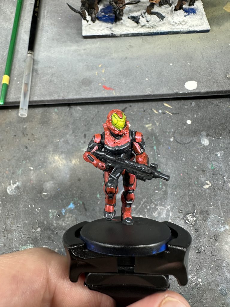 Next you will pick out the armour panels with the metallic red. While this has some self levelling qualities, it will still need a couple of coats for complete coverage. After you have picked out the armour panels you wish to be metallic red, it is time to paint the under suit.