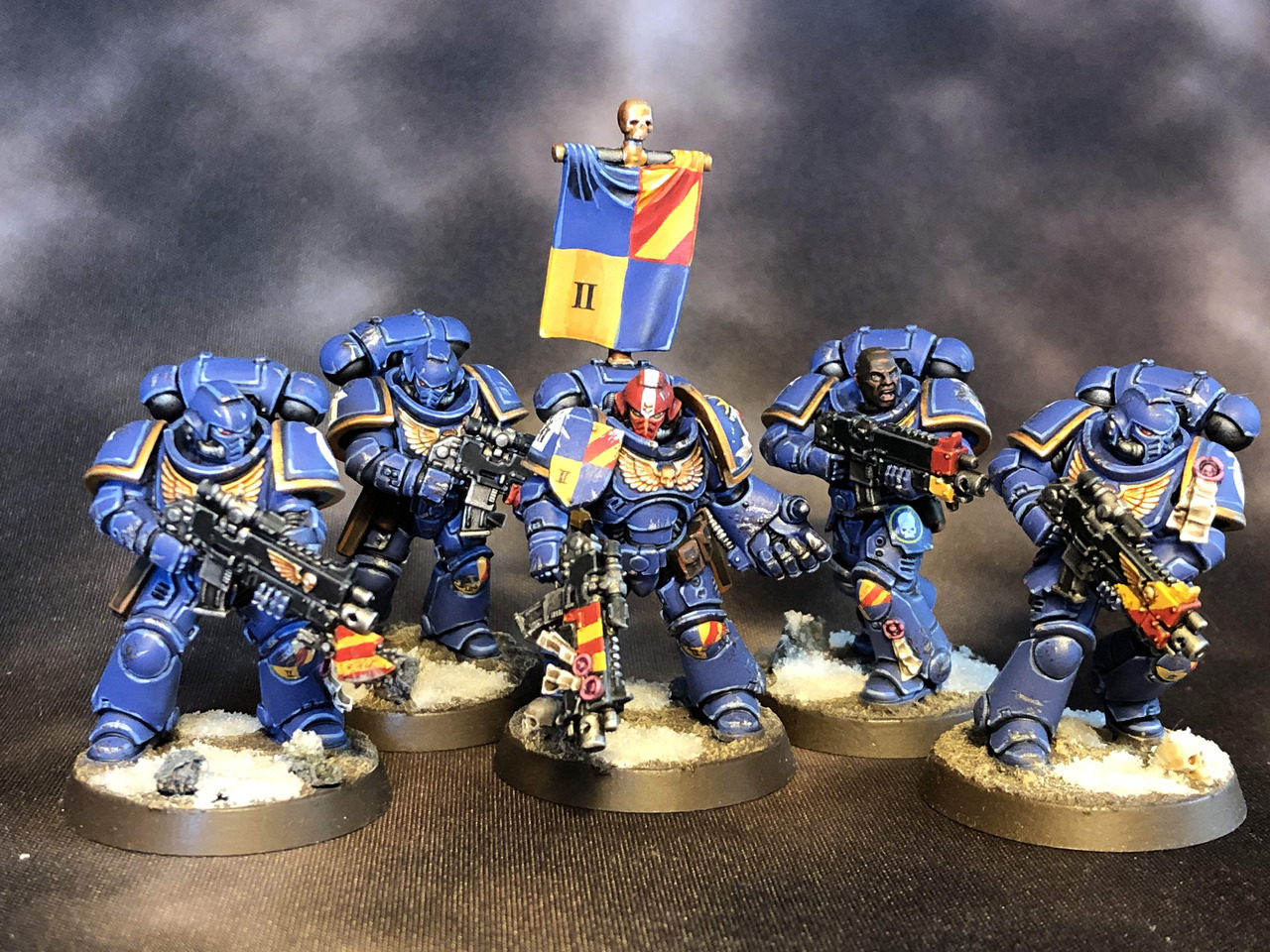 Ancient regents and warlords would identify their units at a distance with banners and shields, and you can do the same! At some point, everybody has had the issue where multiple units blend together on the tabletop. Maybe two mobs of Ork Boyz got too close to each other and you had to remember which mob took casualties and which one didn't. Maybe your three squads of Guardsmen were supporting each other too closely and now one squad is twelve lasguns and two sergeants and the other has all your plasma guns in it. While Intercessor Squads I-IX are all using the same models in the same scheme, you can add some identifying heraldry to mark each squad out. For example I'll show two of my squads of Intercessors, both built from Dark Imperium: