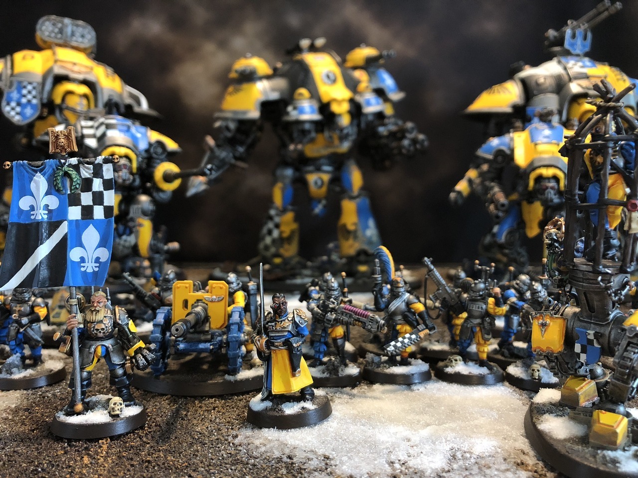 A bunch of "merely okay" paintjobs are elevated by a nice banner and a uniform paint scheme.Alternatively, heraldry can be something you lavish attention on, using it to make a good paintjob a great one. Imperial Knights are tailor-made for this, and their large blank armor plates give the opportunity to highlight the individuality of each Knight.