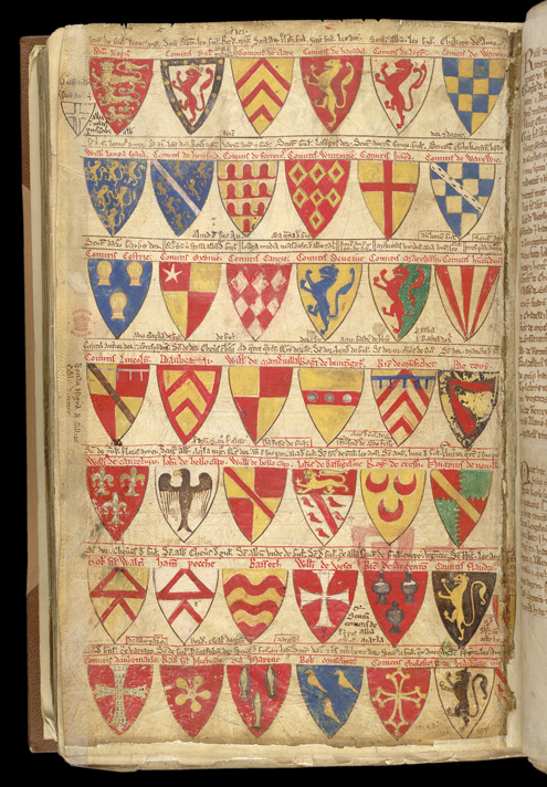 Heraldic shields of King Henry III and his nobles, circa 1250The usage of animals, patterns, and colors each tell a story about the people bearing the shield. Said shields would often be integrated into a coat of arms or family crest, which involved banners, helmets, wreaths, badges, animals, and other design elements. You wouldn't usually see a full coat of arms portrayed on a shield, but these complex designs could be found on banners or tapestries belonging to nobles and knights.