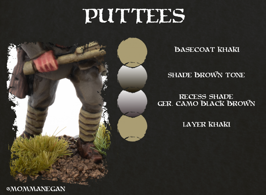 Credit: MommaNeganLast of the recipes is the simplest, the puttees. These are relatively straightforward, starting from a basecoat of Khaki (any will do, but I am using the Vallejo Model Color one). We shade that with Army Painter Brown Tone; once that is dried, water down some Vallejo German Camo Black Brown and apply that into the recesses between the bandages; this step ensures a clear definition of each bandage and deepens the shadow and implied dirt caught in them. The last step is re-applying the Khaki, you can either do one solid coat or try and glaze towards the bottom, applying a highlight to the bottom edge.