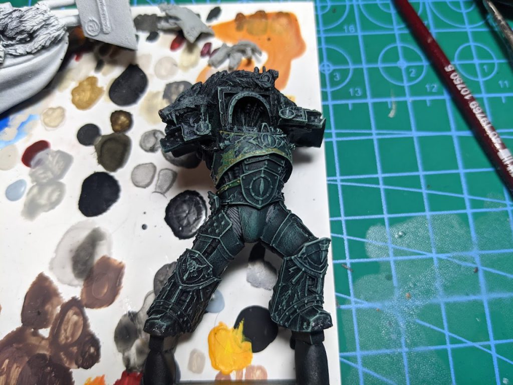 After priming black, I painted the model in Abaddon Black. This way, it would have the same finish as the rest of my Black Legion/Sons of Horus stuff. I then gave the model a drybrush of Lupercal Green. I gave correspondingly lighter drybrushes with Sons of Horus Green, Death Guard Green, and ultimately Ulthuan Grey (using the same drybrush, to make the Ulthuan Grey a light green-grey). This let me see all the detail in the armor, and better plan what to do next.