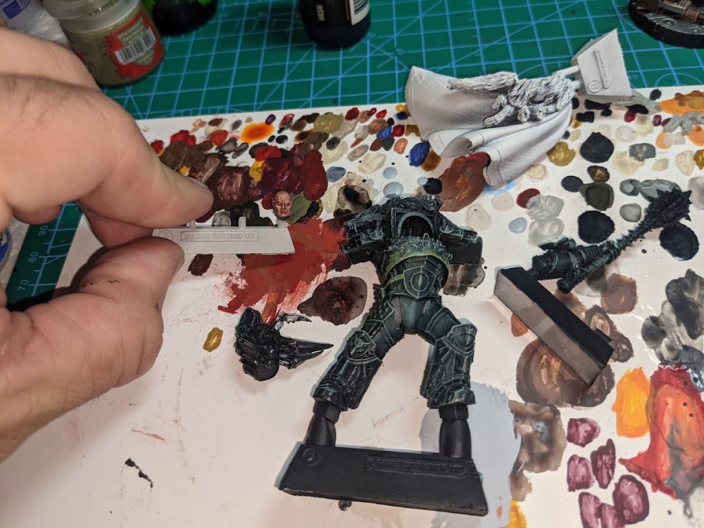 Worldbreaker was painted in Thrash Metal, and then given a wash of Cryptic Armorshade Gloss in the recesses at the top of the mace. I then rehighlighted the ridges of the mace with Thrash Metal. The grip was washed with Secret Weapon Miniatures Armor Wash, and the notches were painted with Snakebite Leather.