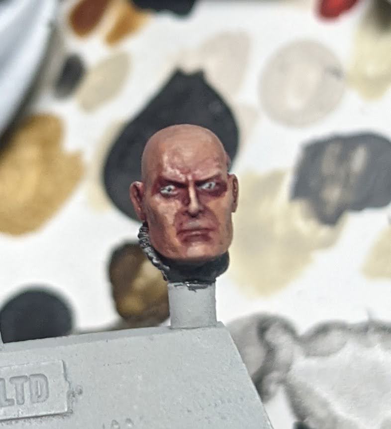 I painted Horus' face shortly after the Warhammer+ video on painting Caucasian skin debuted, and that informed my thinking as to how to paint Horus. I basecoated Horus' head with two thin layers of Reaper Kobold Scale, but any reddish-brown will work. I then painted the recesses under the eyes/nose and mouth with Gal Vorbak Red. Gal Vorbak Red is a purple/red, and works well as a shadow color to the reddish-brown of Kobold Scale. Then, I did two glazes of Bugman's glow. The first glaze was painted all over. The second glaze layer was painted just on the raised areas, leaving the GV Red and Kobold Scale just in the recesses. From there, I slowly layered up to Cadian Fleshtone, and then a blend of Cadian Fleshtone and Pallid Witch Flesh for the most prominent areas of his head.