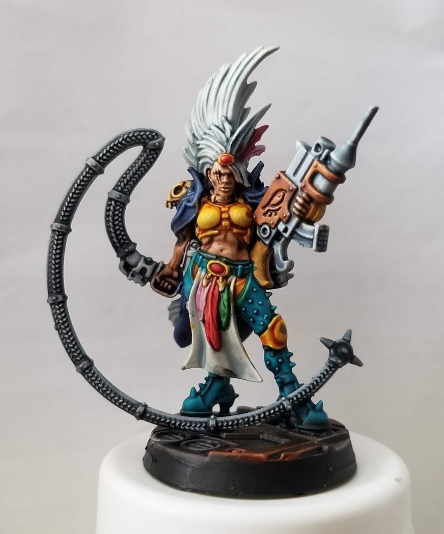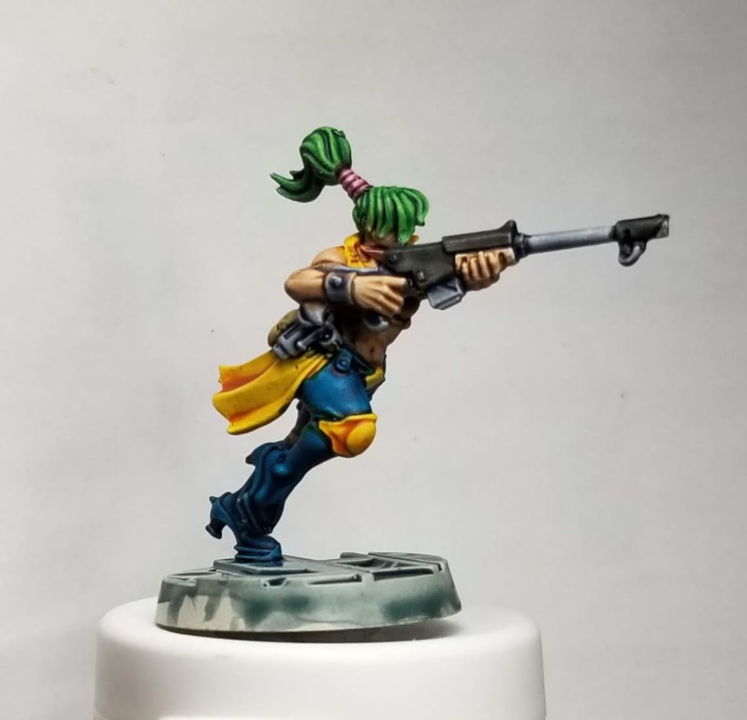 The 90's making a comeback in hairstyles at leastAs for the actual paints I used... Turquoise: Ahriman Blue base, Temple Guard Blue highlight, Baharroth Blue edge highlight Yellow: Averland Sunset base, Iyanden Yellow Wash, Averland Sunset highlight, Flash Gits edge Highlight Boots: Abaddon Black base, thick Incubi Darkness highlight, thinned Bascilanum Grey wash, highhlight of Incubi Darkness In terms of skin tones, I was trying all sorts. Mostly inspired by ZIV’s HTPE post on human skin