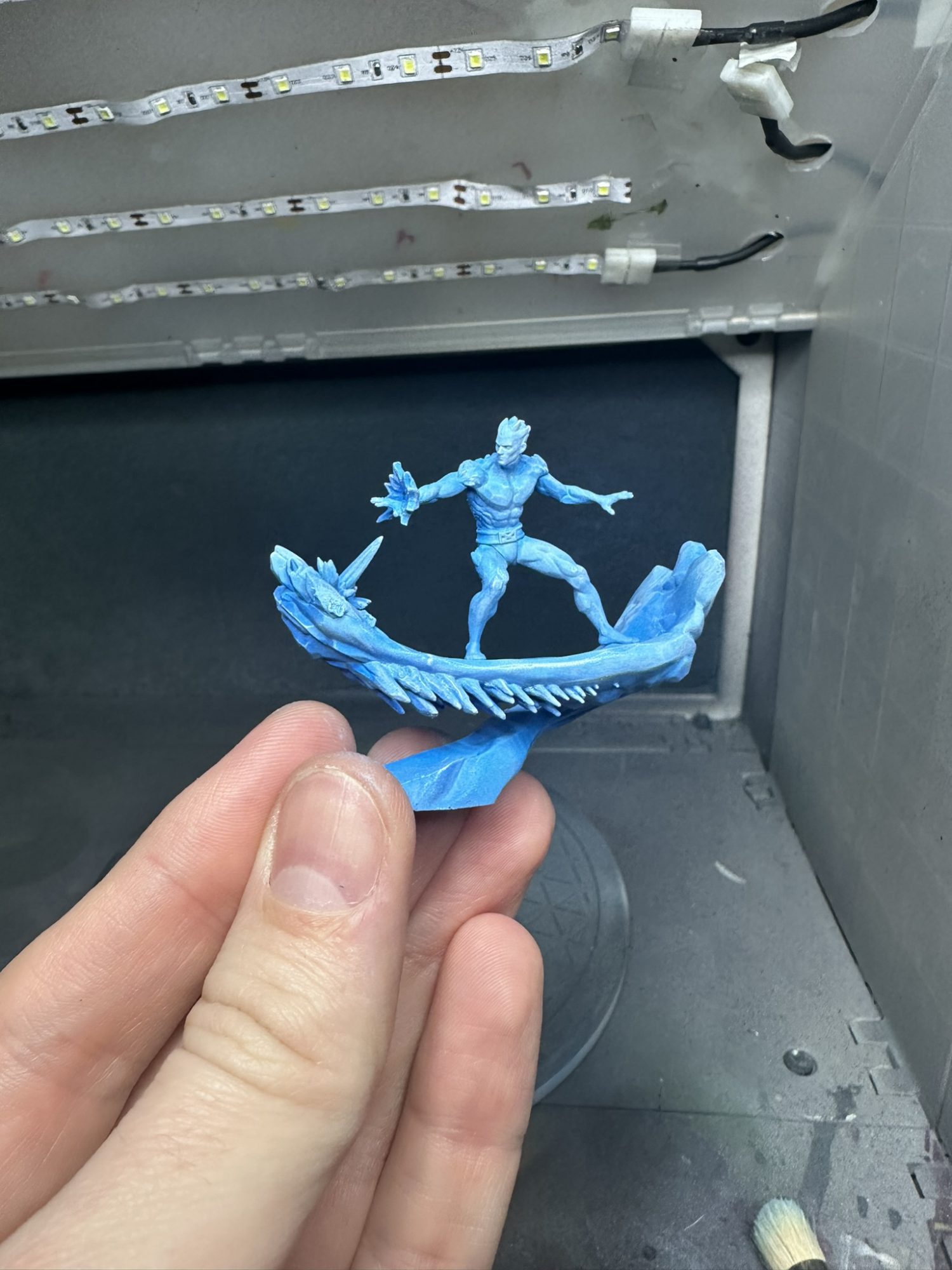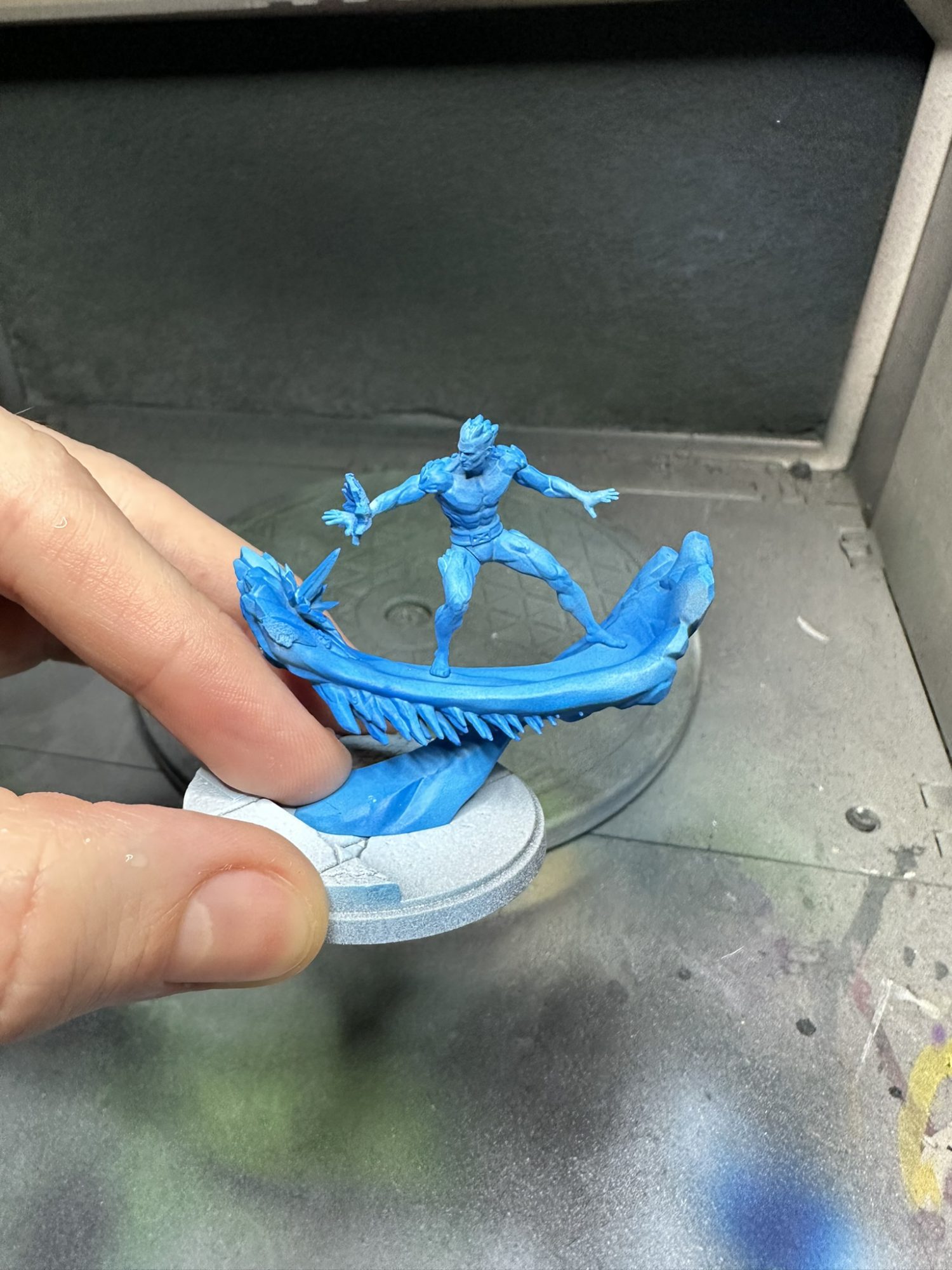 Credit: Raf CorderoMy normal process for painting Marvel minis is to start with an airbrushed Zenithal and hit them with Speed Paints. Iceman posed a bit of a challenge, however, given that he is all essentially one color. Speed Paints and Contrast paints can get blotchy when painted on large flat surfaces which Iceman is full of, so I took a different approach. I still started with an airbrushed Zenithal (Ulthuan Grey, Administratum Grey, and White Scar) though I kept it pretty bright.
