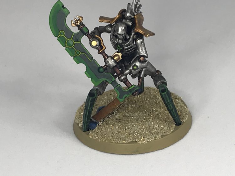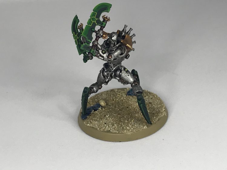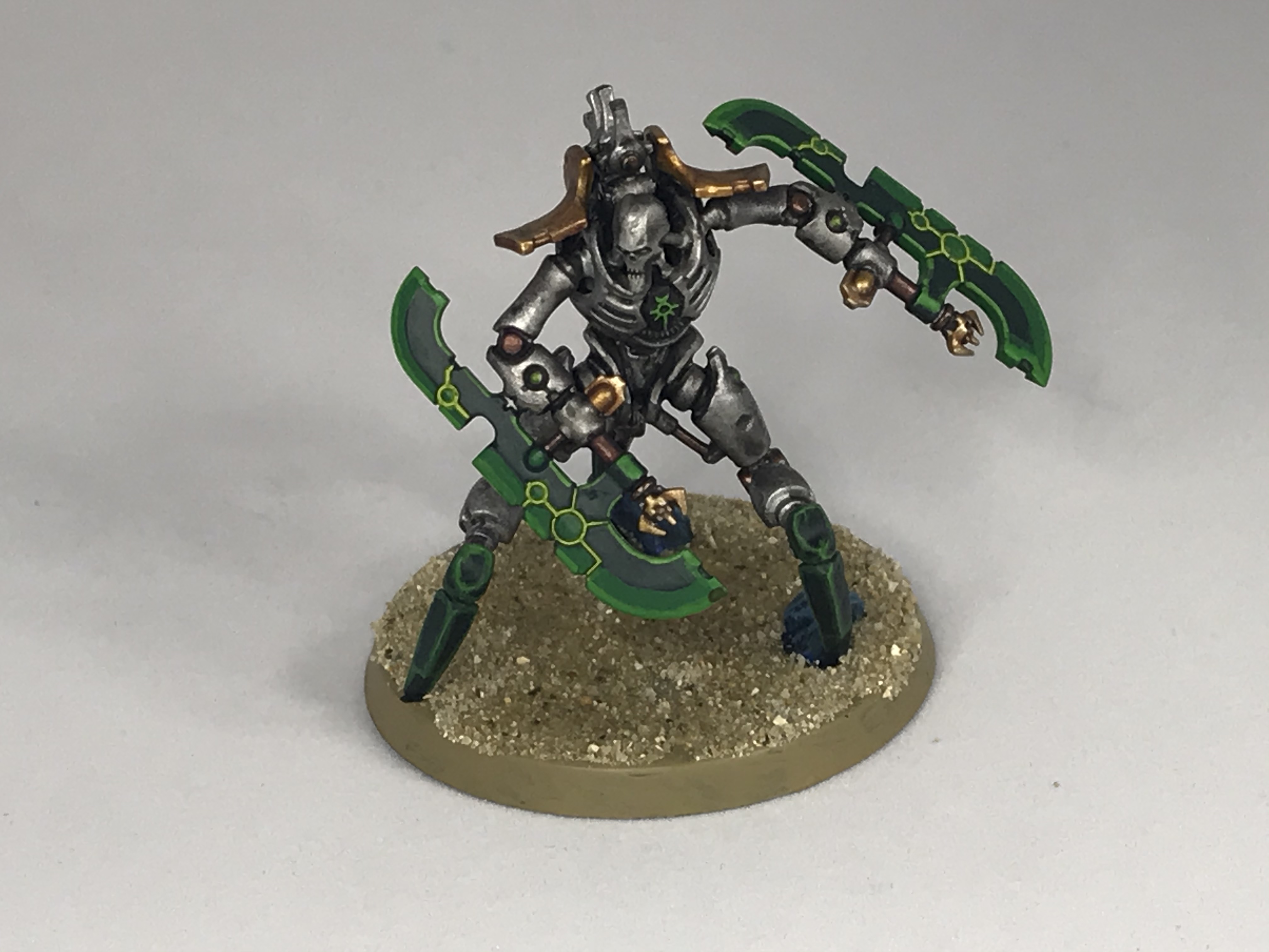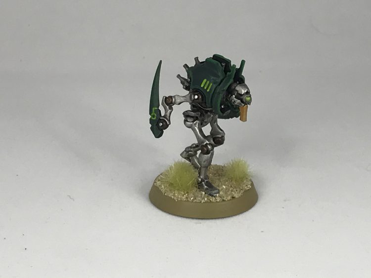 After that, now we're done with any paint applications to wide areas, we finish the legs and blades. The legs get an edge of Moot Green applied via very gentle drybrushing, while for the blades 1:1 Moot Green/Warpstone Glow is used to edge round the back of the weapon, and do a much thicker line on the blade cutting edges. The blades are then finished by a thin edge highlight of Flash Gitz Yellow direct on the blade cutting edge, and an energy glow added to the recesses. To do the latter, I mixed about 2:1 Flash Gitz Yellow and Moot Green and then thinned it down a lot with water. With a detail brush, I then applied it to the recesses, letting capillary action draw it in and wiping any that escaped away quickly with my thumb. This also goes on any of the "vents" that Canoptek canopies tend to have.