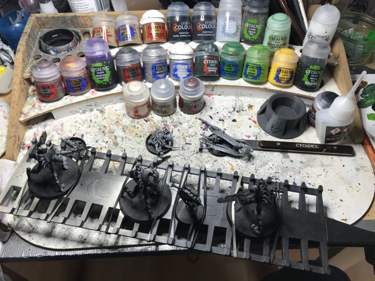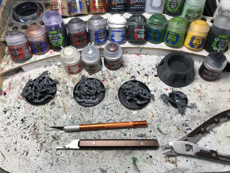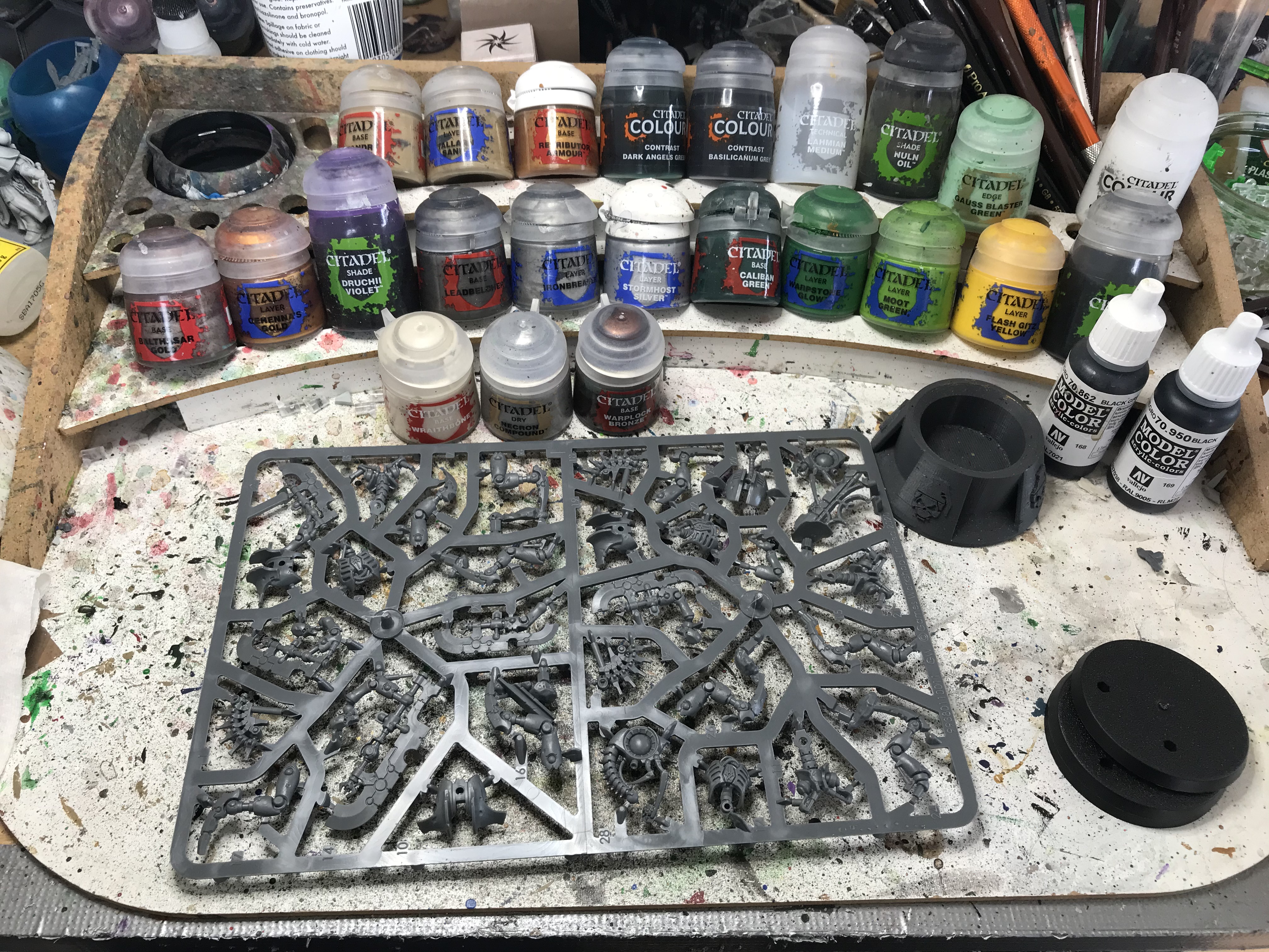 Step 1, of course, is to assemble all required tools - I set up here with the sprue for the Skorpekh and roughly the set of paints I thought I'd need.