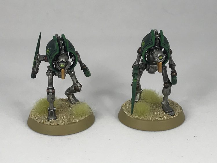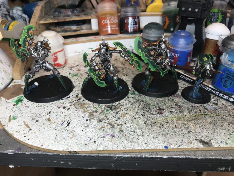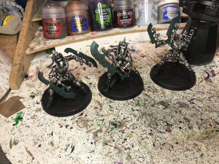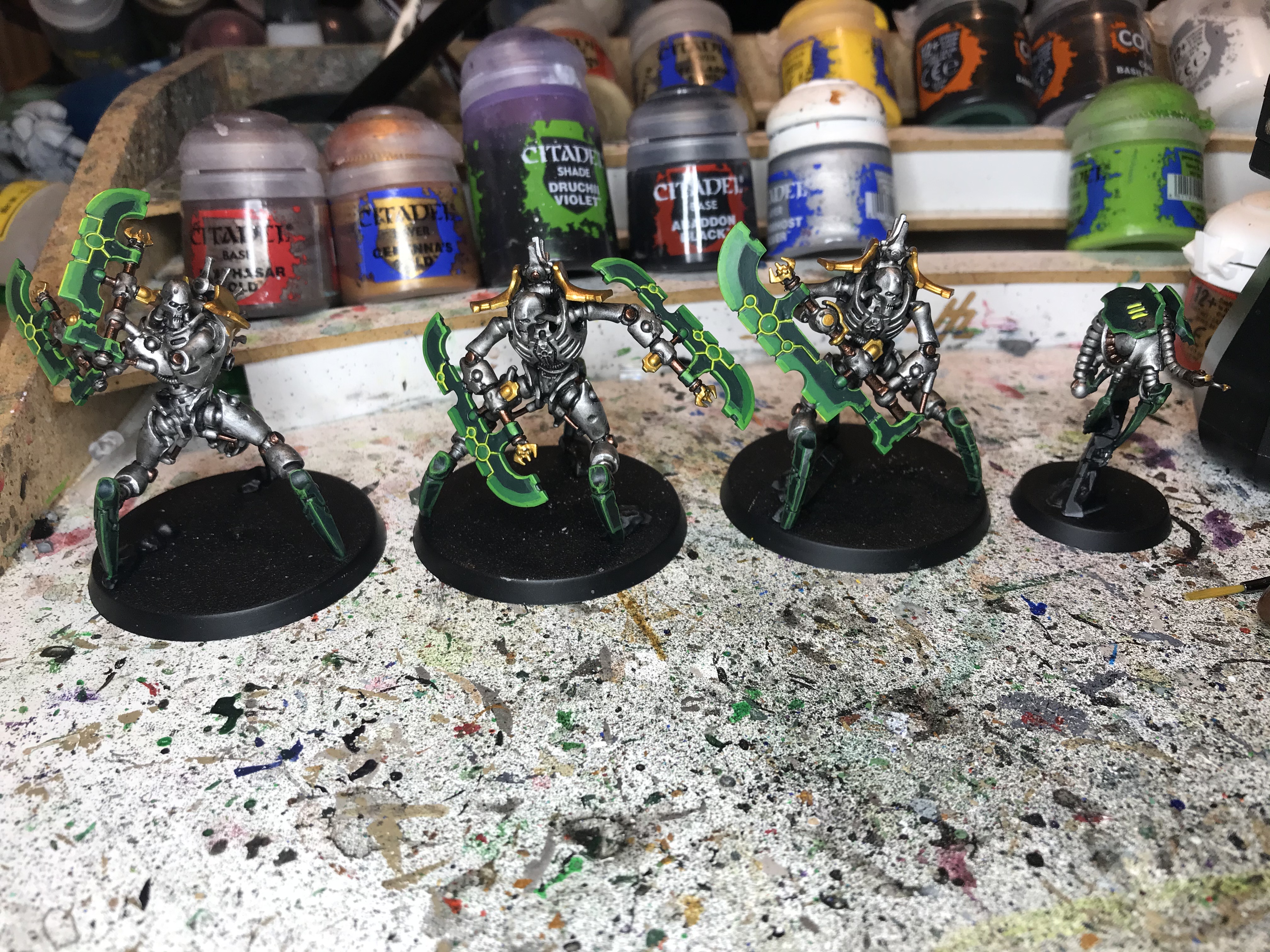Once that's figured out, I based everything that was going to be metallic in Leadbelcher thinned with Lahmian Medium, and everything Canoptek or an energy blade in Caliban Green thinned with water. Previously when working on Canoptek stuff I've used Caliban Green Spray (now out of production), and what I found here was that CG paint alone was a little bit more of a vibrant green than I really wanted for the base on the legs. Here I salvaged it by darkening down with a wash of Dark Angels Green contrast, for all later models I used 2:1 Caliban Green/Incubi Darkness, which gave what I wanted straight away. Once both are applied, I then apply a layer of thinned Ironbreaker to the silver as well.