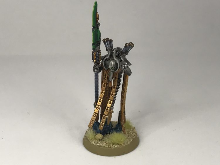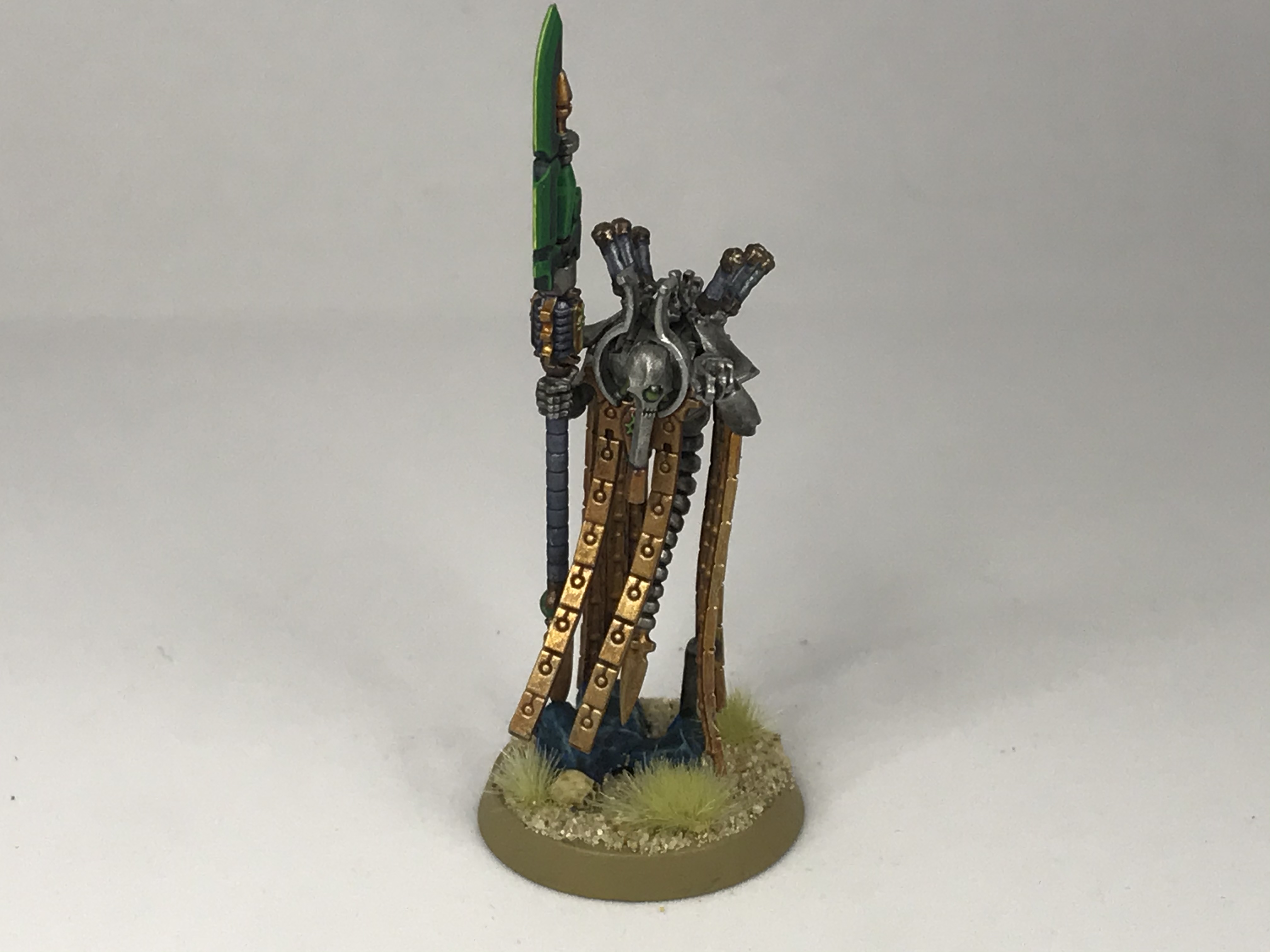 The Plasmancer has a couple extra things going on. For the bodywork on the staff, I used Grey Knights Steel washed with Drakenhoff, giving a distinctly different kind of metal for a different surface, helping add definition to the overall piece. He also gets a gold chestplate, as befits a more senior Necron. The crystal on his staff also gets a slightly different technique to everything else, being coated with Warpstone Glow, edged with mixed Warpstone and Moot Green, then washed with Aethermatic Blue. The last step didn't really do much, so I'll probably try Akhelian Green for the next similar thing.