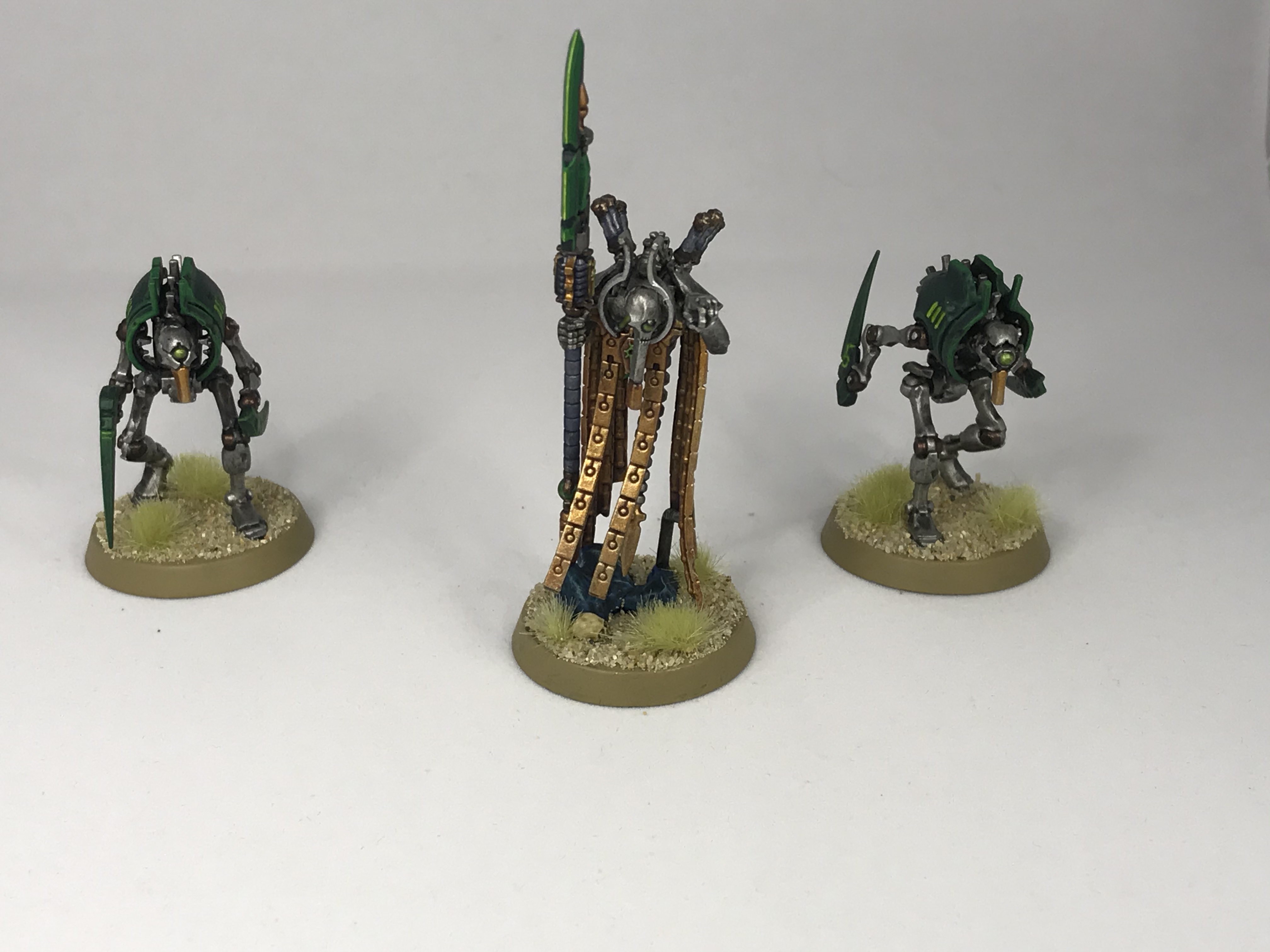 From here we're nearly done. The gold parts get washed with Druchii Violet, then drybrushed with Gehenna Gold and then lightly drybrushed on the edges with 1:1 Retributor Armour/Stormhost Silver. The models have what are clearly "energy orbs" on a few places, so these I hit with Stormhost Silver then thinned Ork Flesh Contrast. For the Plasmocyte, I gave it an evil glowing red eye using Blood Angels Red Contrast over the silver instead. Finally, as these are still non-royalty among the Necrons, they get a black chest runeplate, with the rune itself picked out with Moot Green. A dot of moot green on each of the eyes, and the models themselves are done.