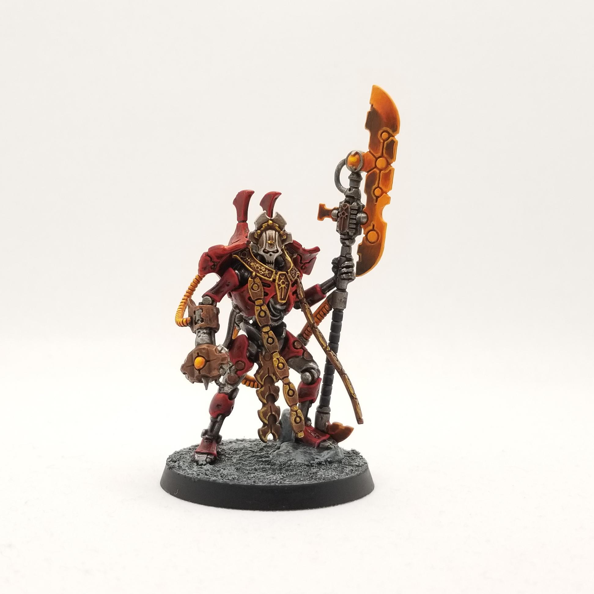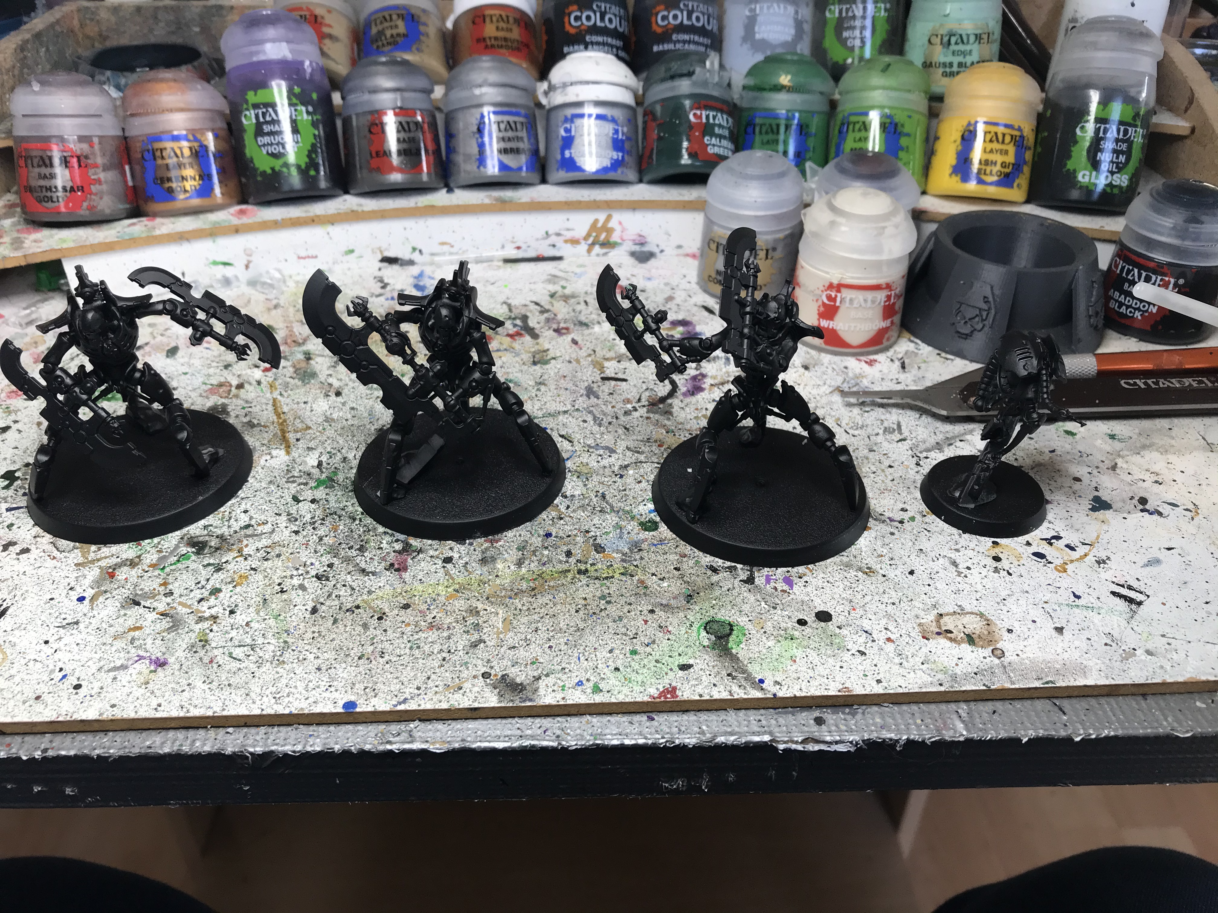 Finally, and I think my favourite of the models I've done so far, the Royal Warden. Most of the techniques here are repeats, but the gun gets some new stuff. The bodywork is Corvus Black on top of the primer, washed with Nuln and then gently edge highlighted with a drybrush of Dawnstone. The barrels sections are a new method I tried out here and worked well - it's just thinned Grey Knights Steel on the whole thing, then thinned 1:1 Iyanden Yellow/Ork Flesh contrast into the recesses and over the orbs. It looks great, and I'll be using it for my Warriors as well.
