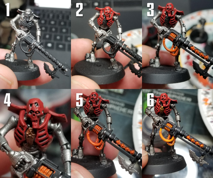 For the Necron Warriors I went with a really simple scheme that can be easily replicated across a large number of models. Metal bodies, Red chests/shoulders/helmets. It's roughly a 9-to-12 step process.
