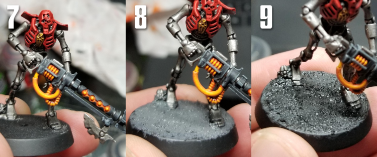 Step 9: Wash the whole thing with Nuln Oil. Once that dries, drybrush it with Celestra Grey.
