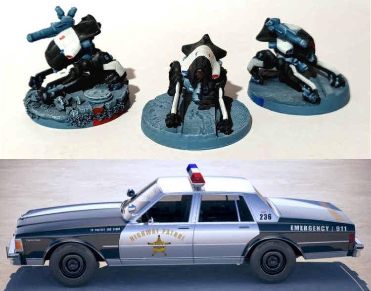In all fairness, I settled on painting my Nomad army as 'space cops' years before O-12 was announced. I was inspired by the classic 'Blues' police uniform and the 1960's police cars you'd see in films (such as the Ford Fairlane and Chevrolet Caprice), as a cute play on the classic Nomad anarchist theme: