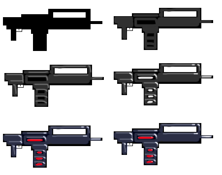 Securitate are buff, yo.Weapons: Basecoat with a hard/pure black (Chaos Black, Abaddon Black, Army Painter Matt Black, it's all the same), then block in/overbrush with a Heavy Charcoal. Fine highlight with a mid-tone grey (Dark Bluegrey again, multiple successively lighter highlights if you're keen). Unlike the vest/body armour above we're going to add fine-point pure white highlights to the weapon because the material (plastic or metal) is more likely to carry a reflective sheen than a cloth/fibre material one might expect from clothing (any Matt White is fine). We also throw some white into the magazine 'bumps' and the 'button' that appears to be sitting where an ejection port would nominally be. Next we blue wash (...and Army Painter Blue Tone once again) the weapon to tint it somewhat to differentiate it from the vest/body armour on the model (which, incidentally, is often visually adjacent to the weapon) as well as throw some red (Model Colour Flat Red 70.957) onto those bumps and buttons we previously painted white. Finally, we come back to the fine-point highlight with dots of white (as the previous highlight would have been tinted blue by the wash), and drop some white dots onto the red sections to lend an impression of 'glow' to them.