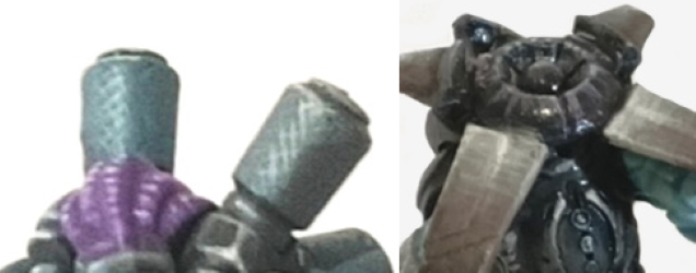 - OSL: I like to use a fluoro green or blue to provide OSL effects to the wrist-band/vambrace comm-links Nomad models have. I do this by dropping pure white onto the lens/button, then a bright, high saturation green (Model Colour Green Fluorescent 70.737 or GW's Tesseract Glow) on top of that. I do the OSL effect by blending the green with whatever colour the surface is painted, with less being more in these instances, and applying it to the surrounding area.