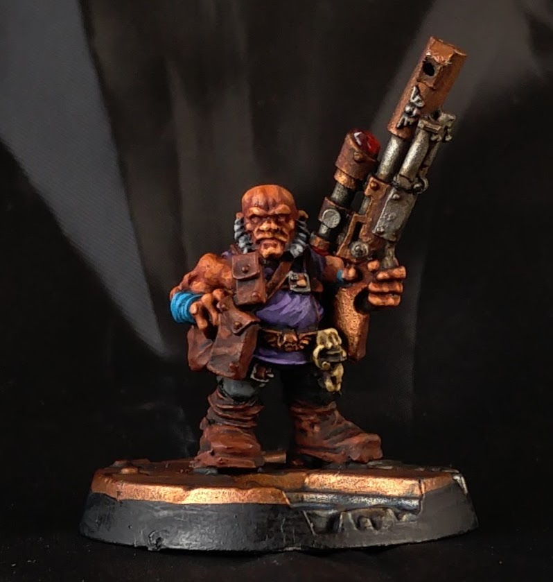 Eventually I settled on a scene to base my paint choices around. He's the man sitting broodingly in the corner of an underhive dive bar. Everyone knows he's trouble and keeps their distance, but nobody really knows how much trouble until a plasma bolt blows off the cult-leader's head and storm troopers start rappelling in through the abruptly installed skylights.