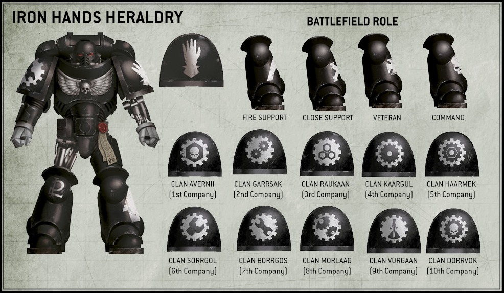 Battlefield roles are instead denoted on the armor of the left leg, while the right knee pad uses gothic script to denote the squad number for the marine. In honor of their primarch, all Iron Hands have steel-colored fists/gauntless.