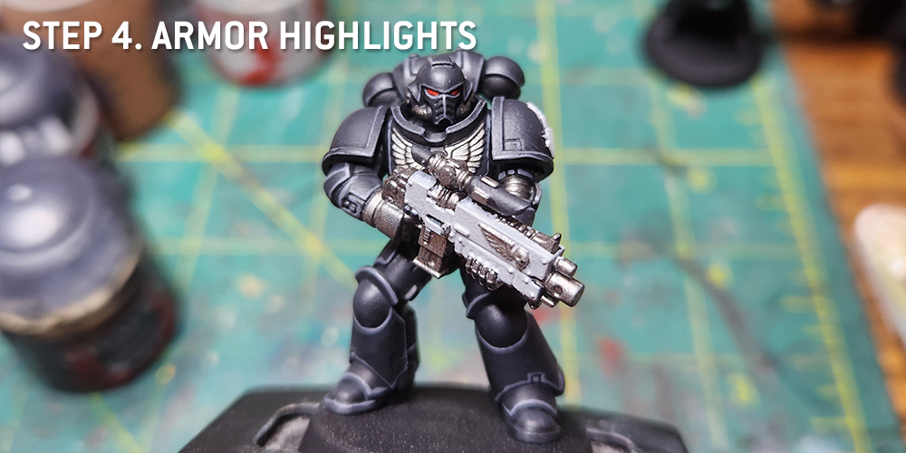 The process starts by highlighting the black armor. This is mostly done by transitioning from Abaddon Black/the Chaos Black of the primer up to Corvus Black. This can be done in 2-3 steps, doing either a 1:1 mix of Abaddon/Corvus if you want to do one transition color, and 2:1 and 1:2 if you want to do two. This will give you a nice color shift on the model that will make details more visible. And while it's subtle in photos, it'll be pretty visible in person.