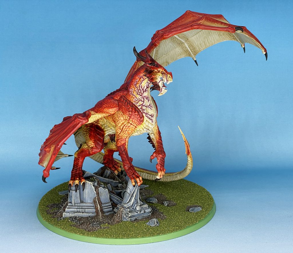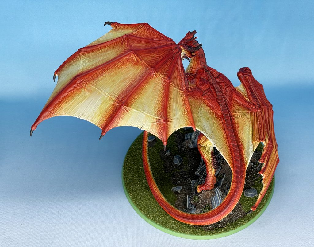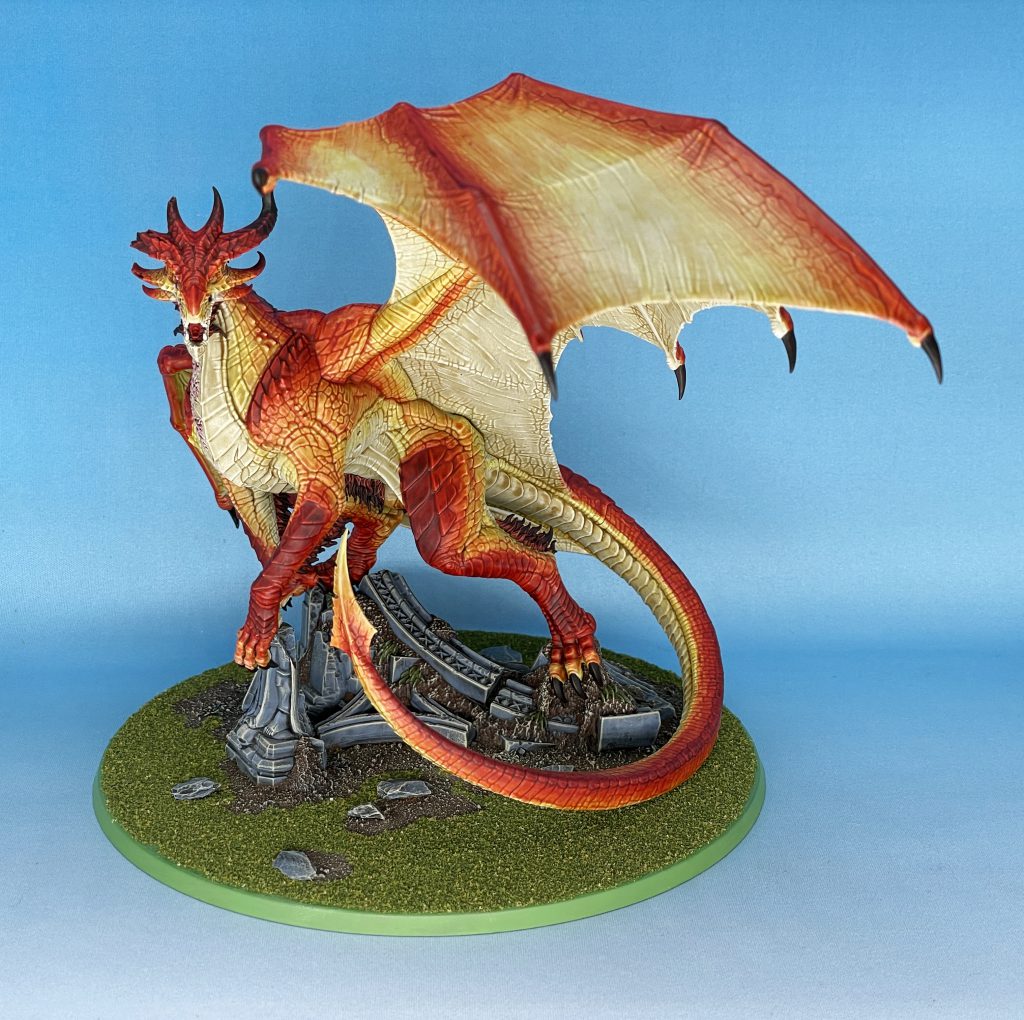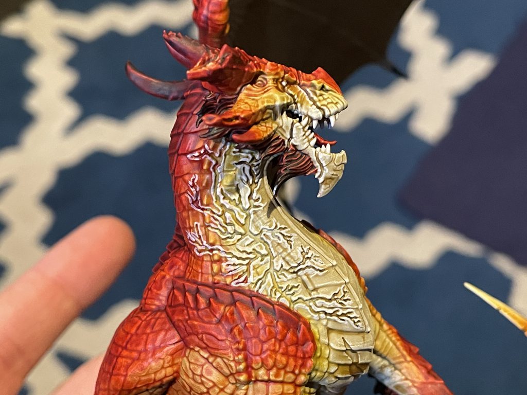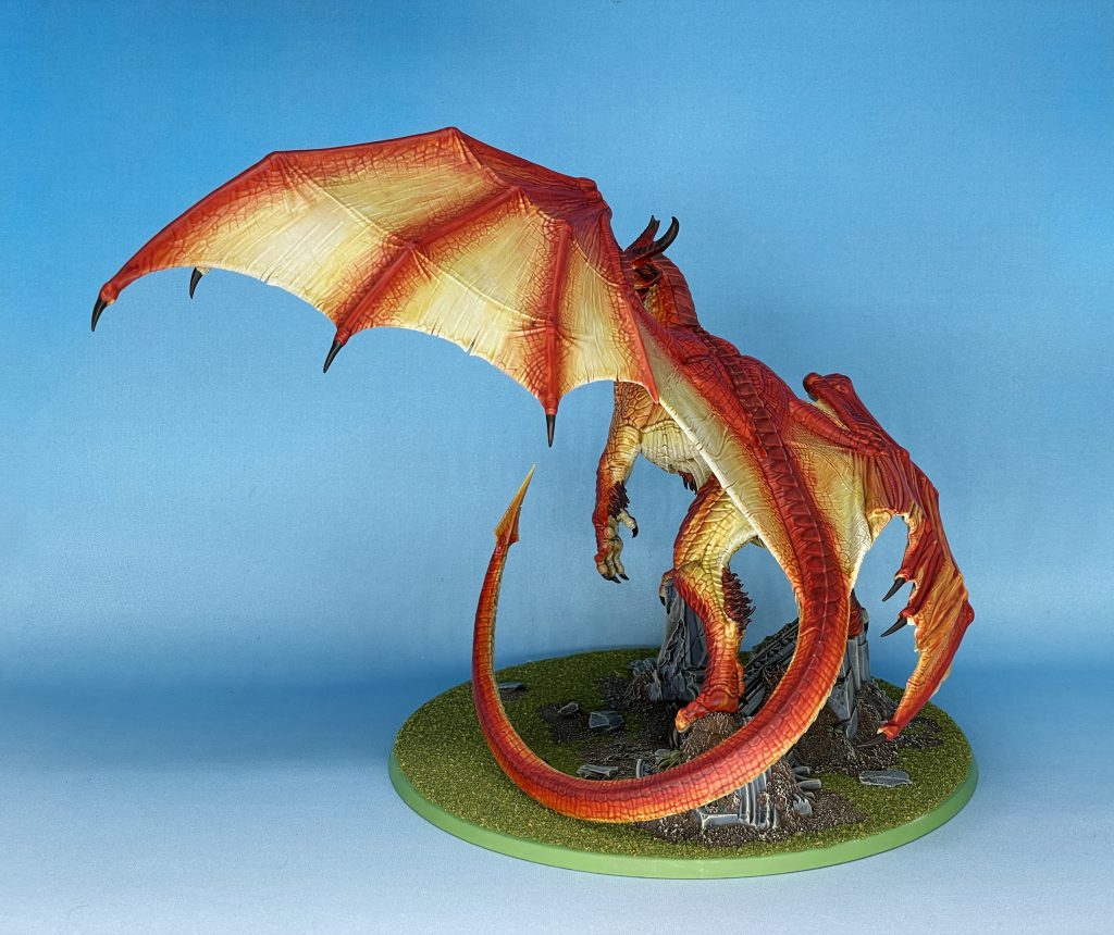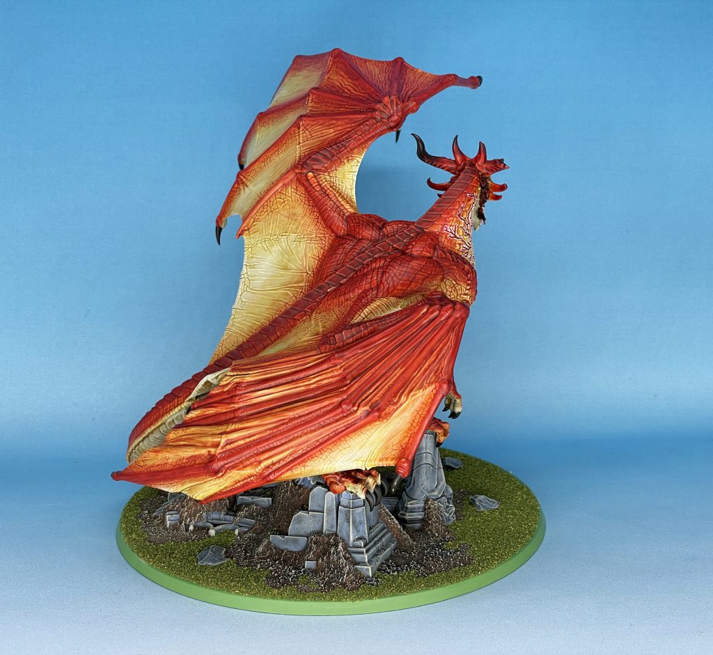 Step 5 top. Credit: Dylan GouldStep 6 was a glaze of 60/40 Blood Angels Red and Contrast Medium on the scales and wing ribs of the outside of the wings, leaving a bit of the previous layer showing and wet blending to smooth them out.