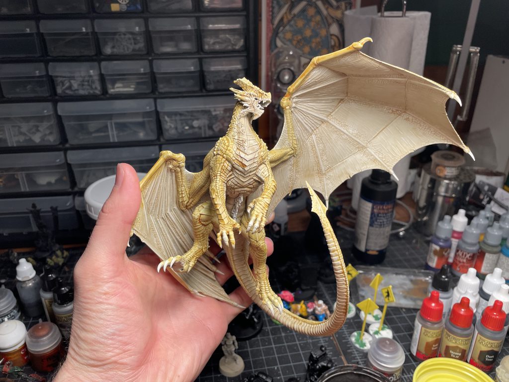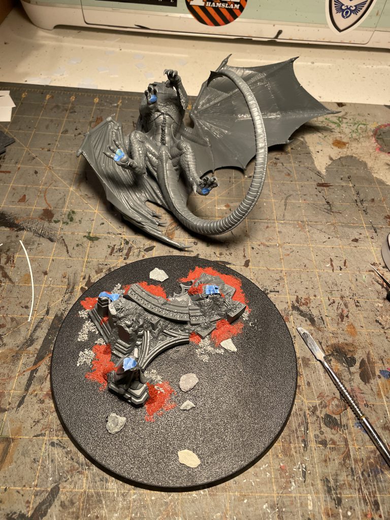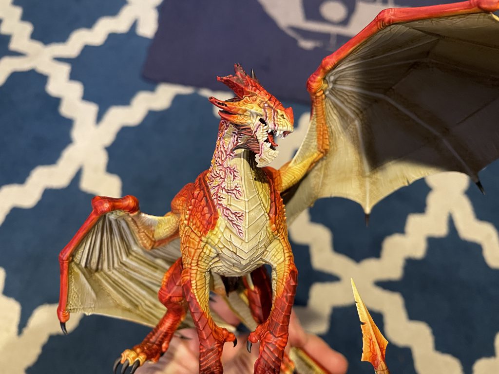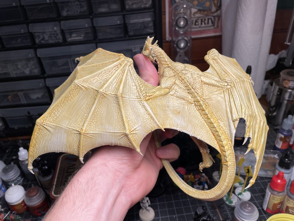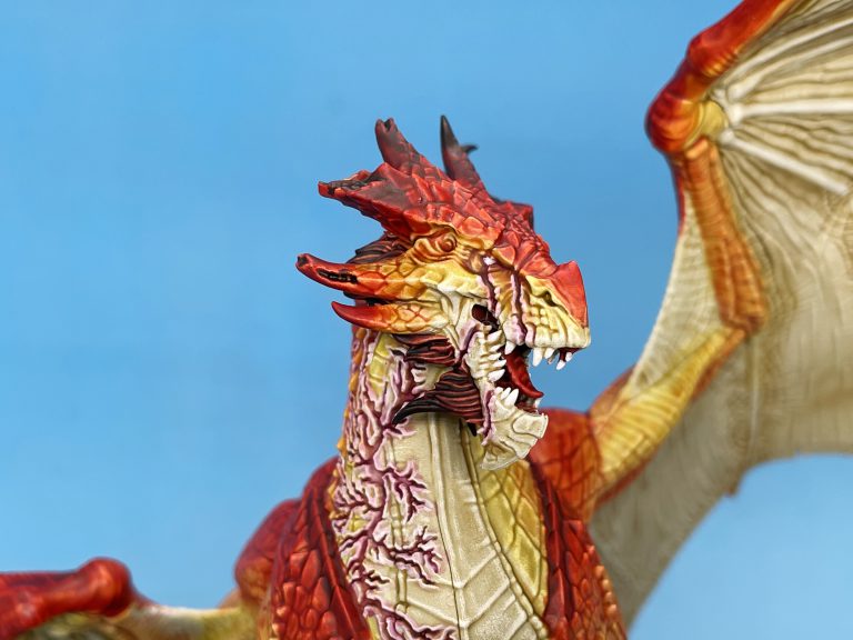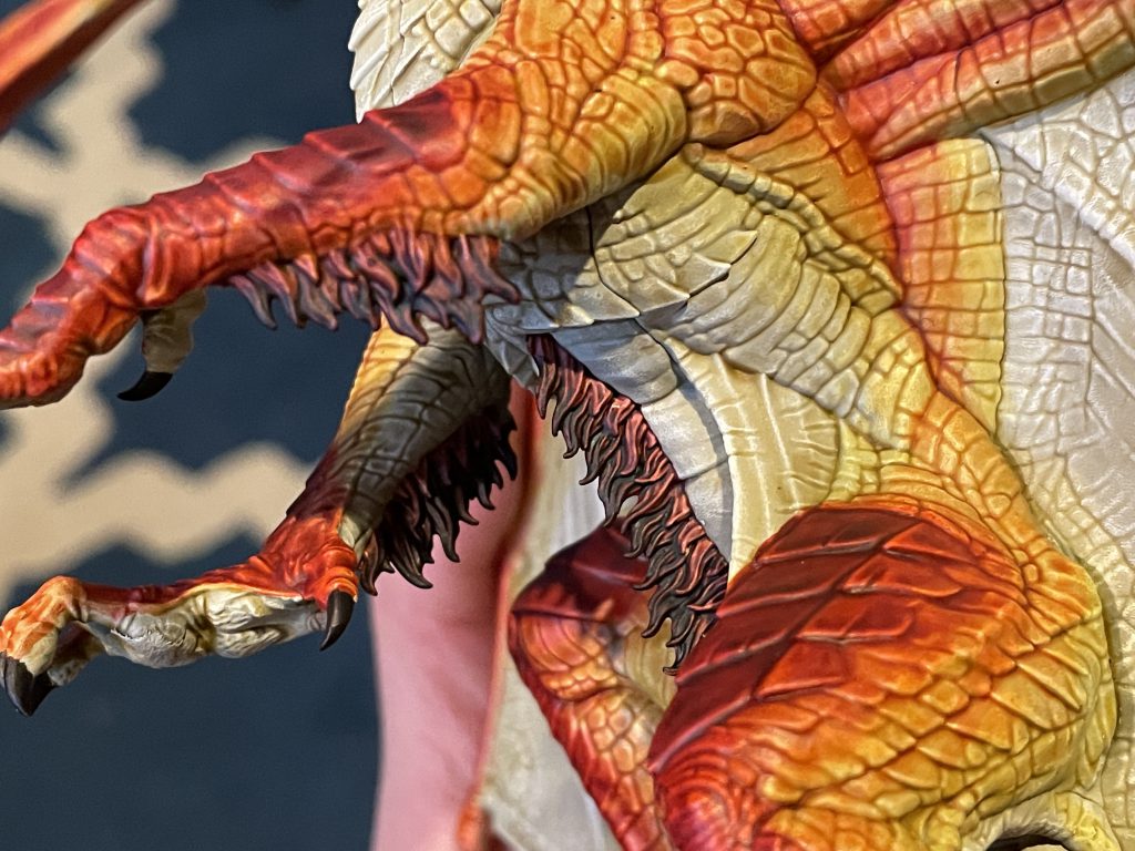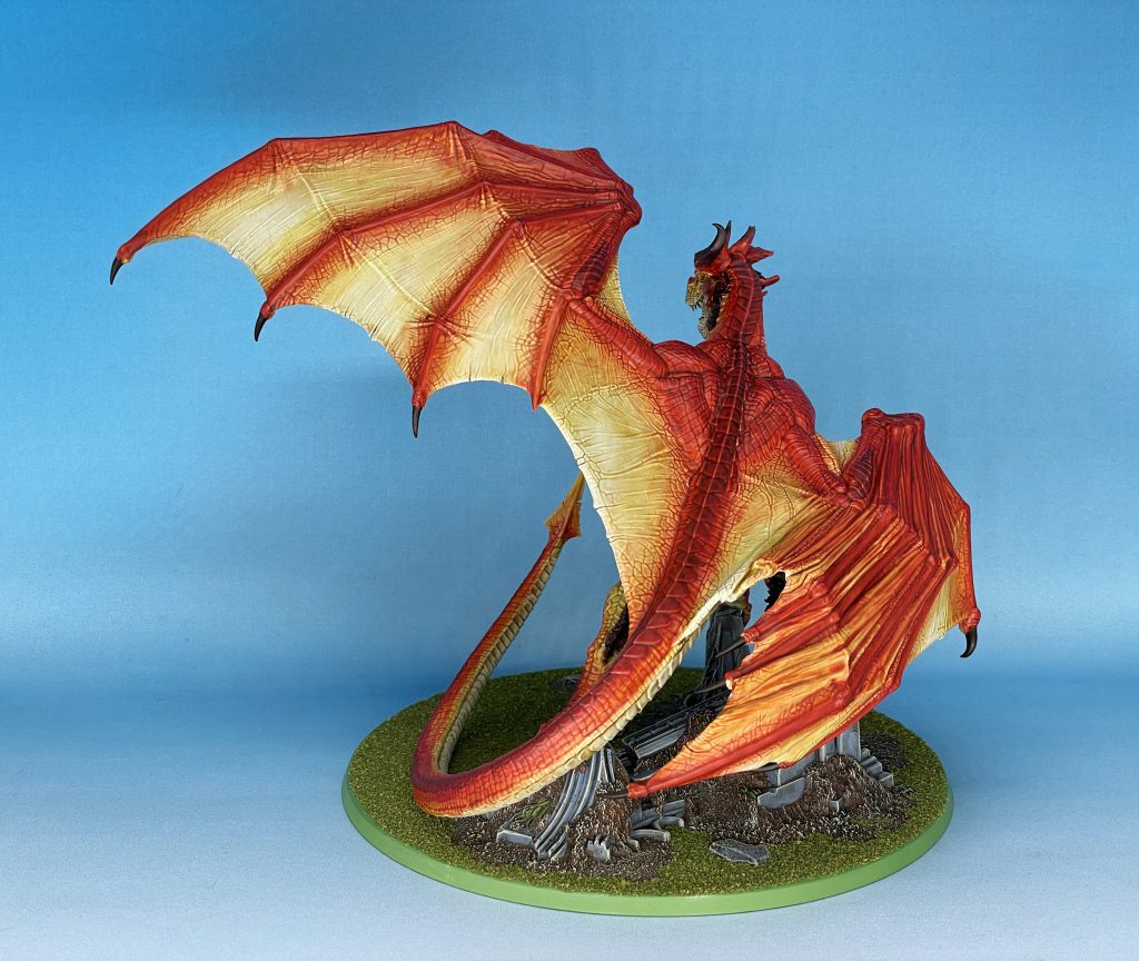 Step 5 top. Credit: Dylan GouldStep 6 was a glaze of 60/40 Blood Angels Red and Contrast Medium on the scales and wing ribs of the outside of the wings, leaving a bit of the previous layer showing and wet blending to smooth them out.