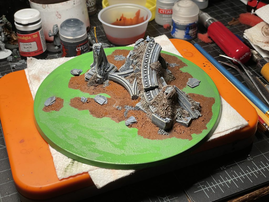 Base WIP. Credit: Dylan GouldI did some highlights on the stone with old school Space Wolves Grey. I put a Black wash over all of it and dry brushed it with Bone. I painted the weeds with the old Foundation Paint Knarloc Green and glazed them with Creed Camo. I painted the rest of the base with Goblin Green.