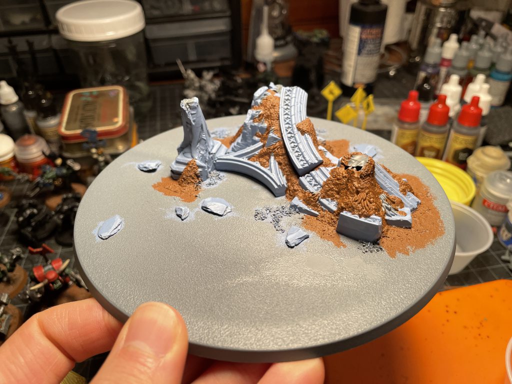 Base WIP. Credit: Dylan GouldAnd that's basically it. I finished the base with a healthy dose of OnOne of mixed flock. And once that was dry, glued him onto the base.