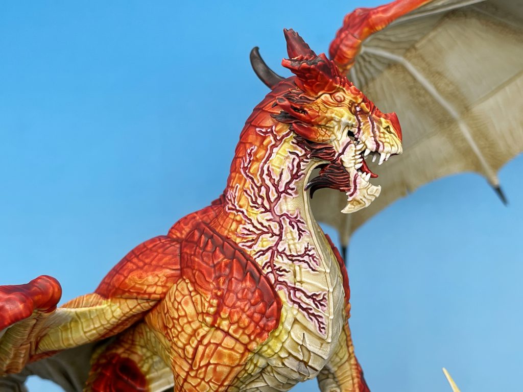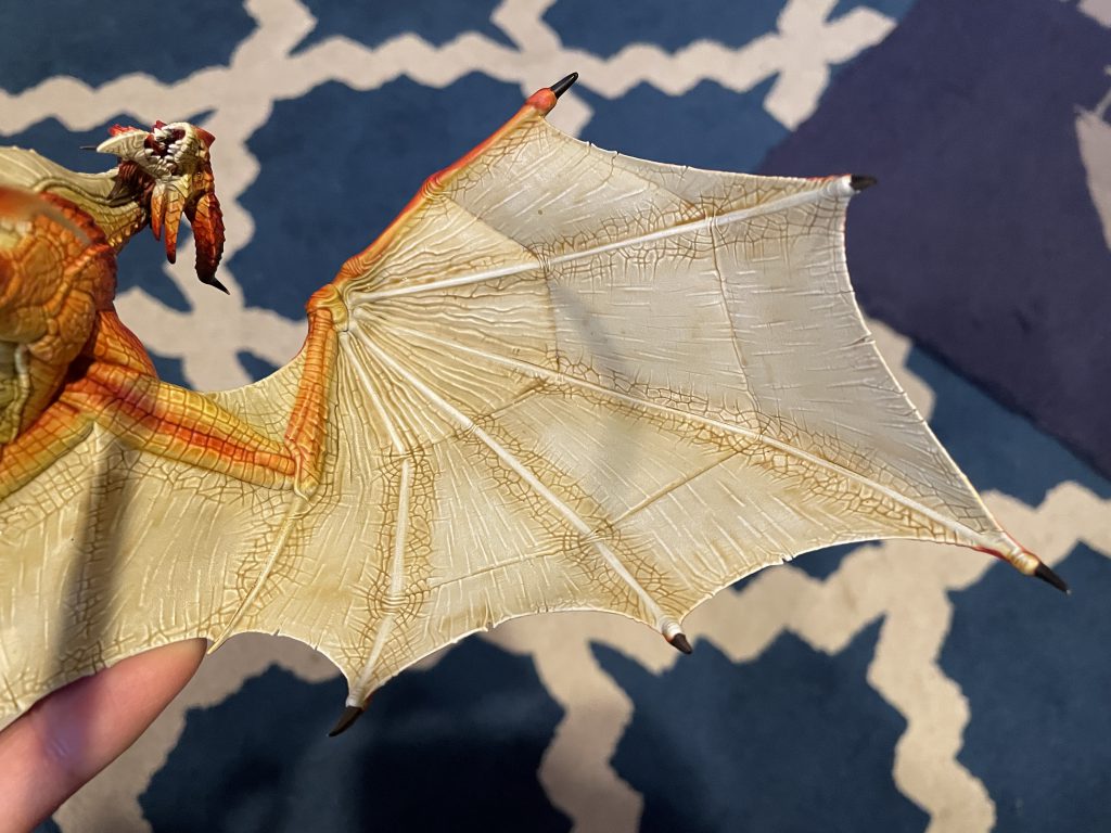 Step 6 wing detail. Credit: Dylan GouldStep 7 was a glaze of 50/10/40 Blood Angels Red, Cygor Brown and Contrast Medium on the scales and wing ribs of the outside of the wings, leaving a bit of the previous layer showing and wet blending to smooth them out. I used this same glaze on the inside of his mouth, being careful not to get it on the teeth or the front of tongue.