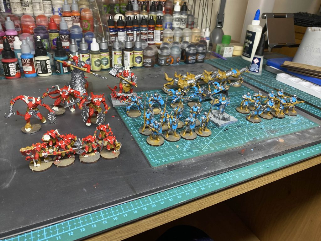 If you're a newer hobbyist and just want to get to playing, we can easily stop here; while some of our slop is still visible, at an arm's length even these simple paint jobs will read well and there's nothing stopping you from coming back later to do a pass of tidying and highlights.