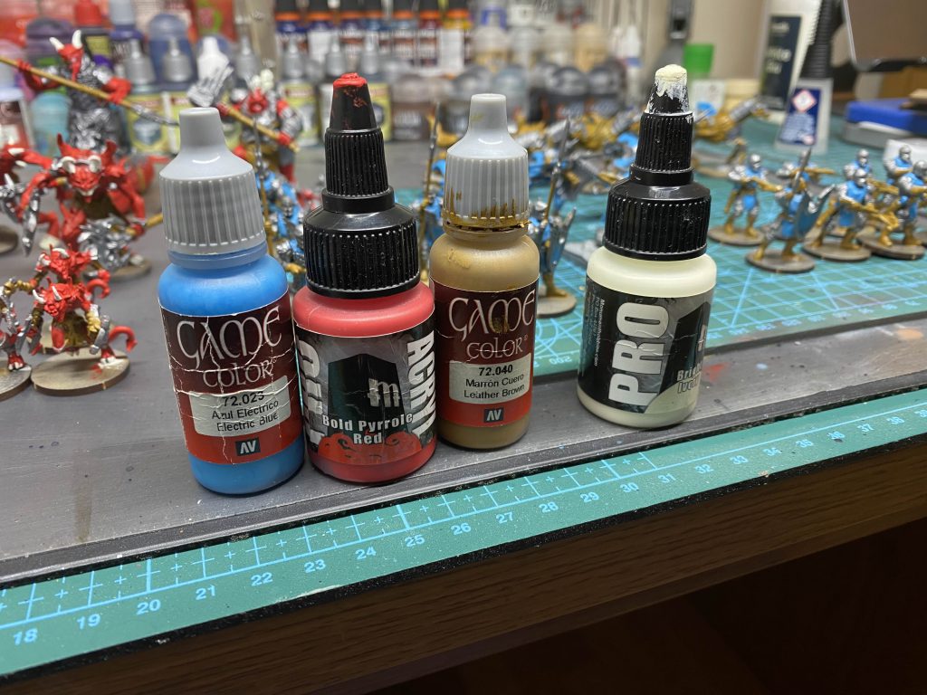 I personally used Game Colour Leather Brown and Electric Blue with ProAcryl Bold Pyrrole Red and Bright Ivory, although any similar colours would work perfectly fine.